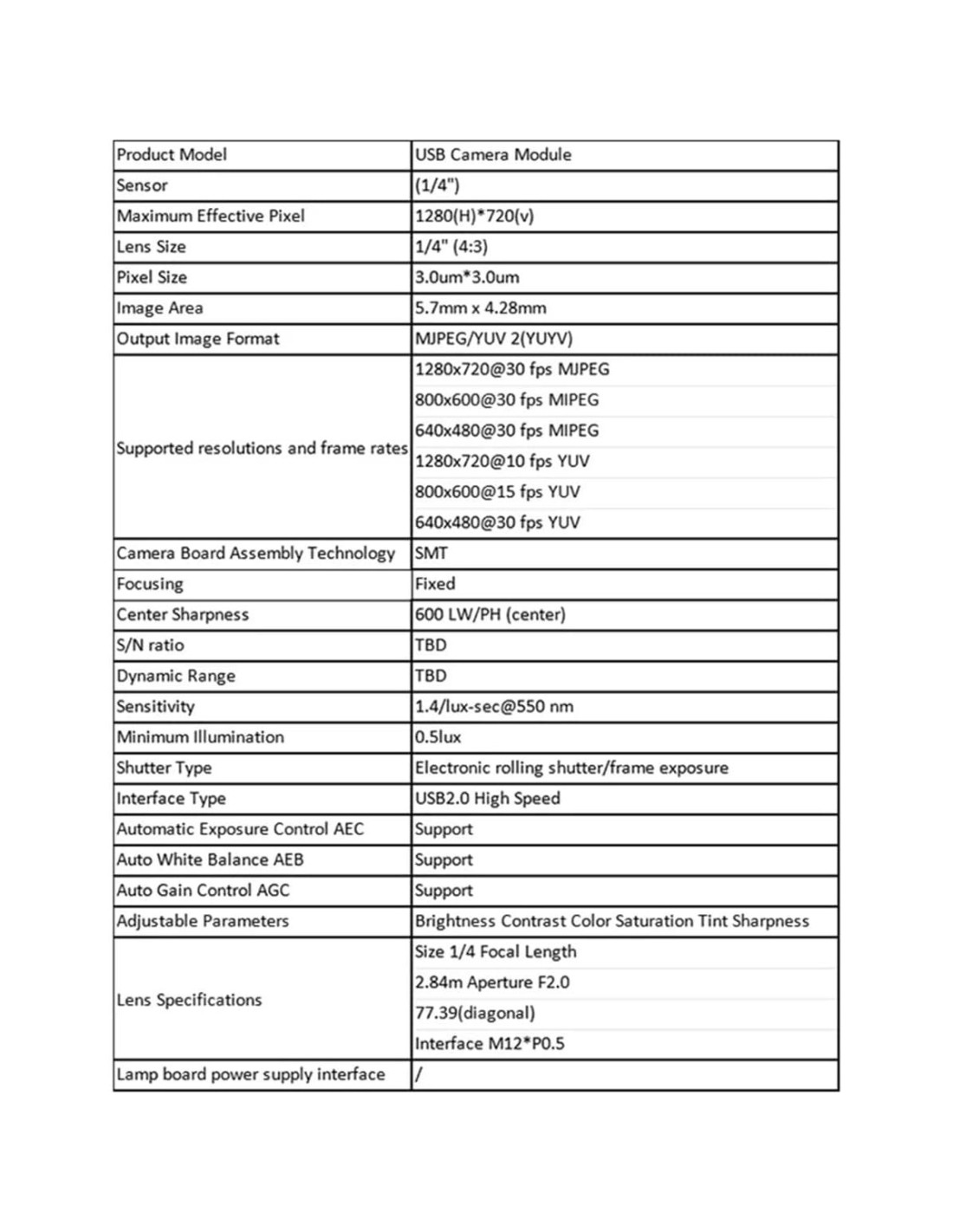 Especificación: 1. Película fotosensible: (1/4") 2. El pixel efectivo más alto: 1280(H)*720(M) 3. Tamaño de la lente: 1/4 pulgada (4: 3) 4. Tamaño del pixel: 3.0um*3.0um 5. Área de imagen: 5.7mm x 4.28mm 6. Formato de imagen de salida: MJPEG/YUV2 (YUYV) 7. Resoluciones y tasas de cuadro soportadas 1280x720@30fps MJPEG 1280x720 @10fps Yuv 800x600 @30fps MJPEG 800x600 @15fps Yuv 640x480 @30fps MJPEG 640x480 @30fps Yuv 8. Tecnología de ensamblaje de la placa de la cámara: SMT 9. Enfoque: Fijo 10. Definición central: 600LW/PH (Centro) 11. Relación señal-ruido: TBD 12. Rango dinámico: TBD 13. Sensibilidad: 1.4V/lux-sec@550nm 14. Iluminación mínima: 0.5lux 15. Tipo de obturador: Obturador electrónico de rodillo / Exposición de cuadro 16. Tipo de interfaz: USB 2.0 Alta Velocidad 17. Control automático de exposición AEC: soportado 18. Balance de blancos automático AEB: soportado 19. Control automático de ganancia AGC: soportado 20. Parámetros ajustables: brillo/contraste/saturación de color/maduración/gamma/balance de blancos/contraste de contraluz/exposición 21. Especificaciones de la lente: Tamaño 1/4 Longitud focal 2.84m Apertura F2.0 77.3(diagonal) Interfaz M12*P0.5 22. Color: Negro Paquete Incluido: 3 X Módulo de Cámara OV9732 de 100 Grados 3 X Cable USB de 2m Nota: Por favor, permita un error de 0-1cm debido a la medición manual. asegúrese de que no le importe antes de ordenar. Por favor, permita una ligera aberración debido a diferentes resoluciones de pantalla.