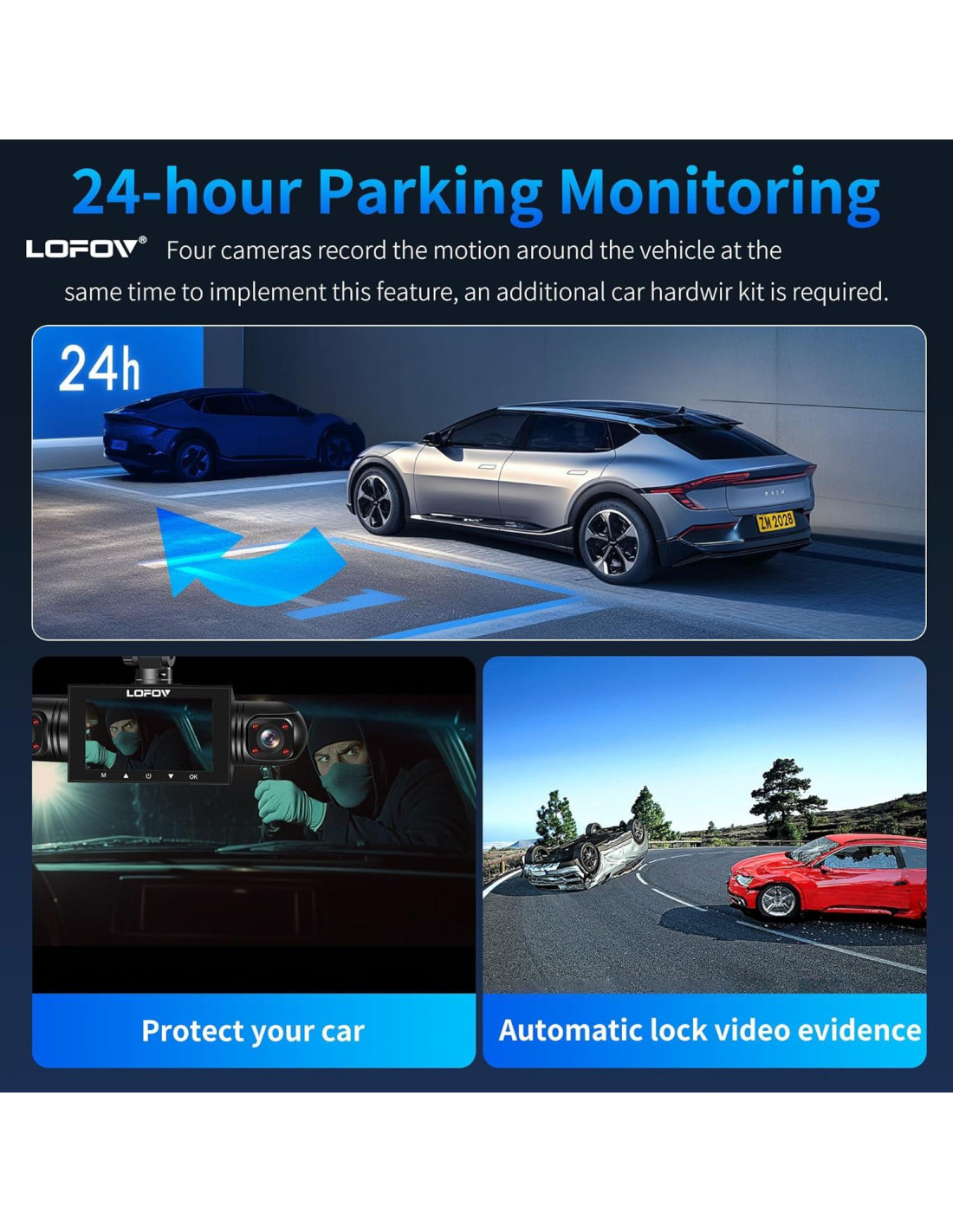 - [Cámara Dash 360 Todos los Lados 4 Canales] La cámara dash LOFOV de 4 canales tiene 4 lentes, todos capaces de grabar video FHD 1080P simultáneamente. Puede capturar los lados delantero, trasero, izquierdo y derecho del vehículo al mismo tiempo. Los 3 lentes frontales pueden ajustar el ángulo de disparo para que pueda capturar más detalles como desee. Puede cubrir fácilmente 360 grados, asegurando que no haya ángulo muerto alrededor del automóvil. Puede usar un lente para capturar el interior de su vehículo.