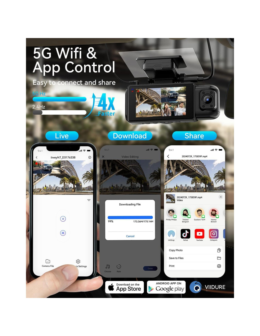 - [WiFi de 5G y Conexión Fácil con el Teléfono] Disfruta de WiFi de 5G de alta velocidad para descargas ultra rápidas, alcanzando velocidades de hasta 8MB/s (en comparación con solo 2MB/s con WiFi de 2.4GHz). Transmite video en vivo desde tu cámara de salpicadero para coches sin problemas en tu teléfono, ajusta la configuración de la cámara, descarga grabaciones y comparte videos sin esfuerzo en plataformas como Instagram, YouTube y Facebook. Puedes usar la aplicación gratis y no se recomienda pagar la tarifa de suscripción.