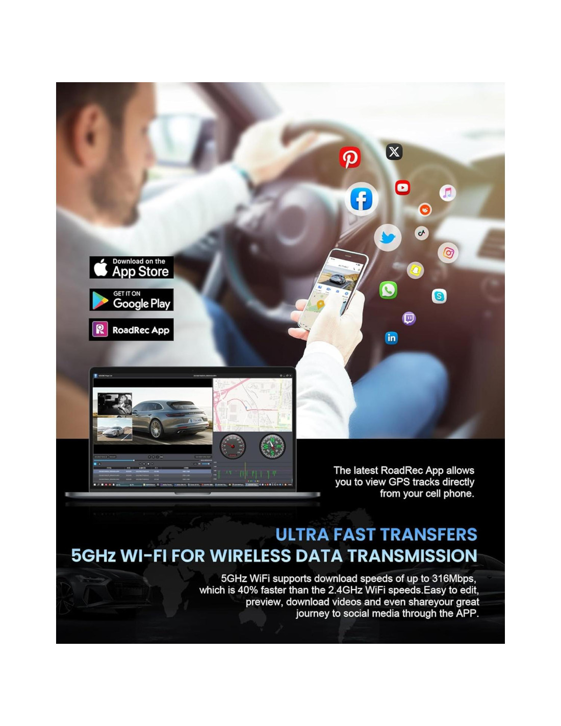 - Tarjeta de 128GB gratis y aplicación RoadRec Administre fácilmente su cámara de tablero utilizando la intuitiva aplicación RoadRec, que ofrece vista en vivo, reproducción, gestión de archivos, bloqueo de emergencia y seguimiento GPS en una sola interfaz. Se incluye una tarjeta SD de 128GB de cortesía (expandible hasta 512GB), asegurando un almacenamiento de video seguro y confiable desde el primer momento. Compatible con iOS y Android.