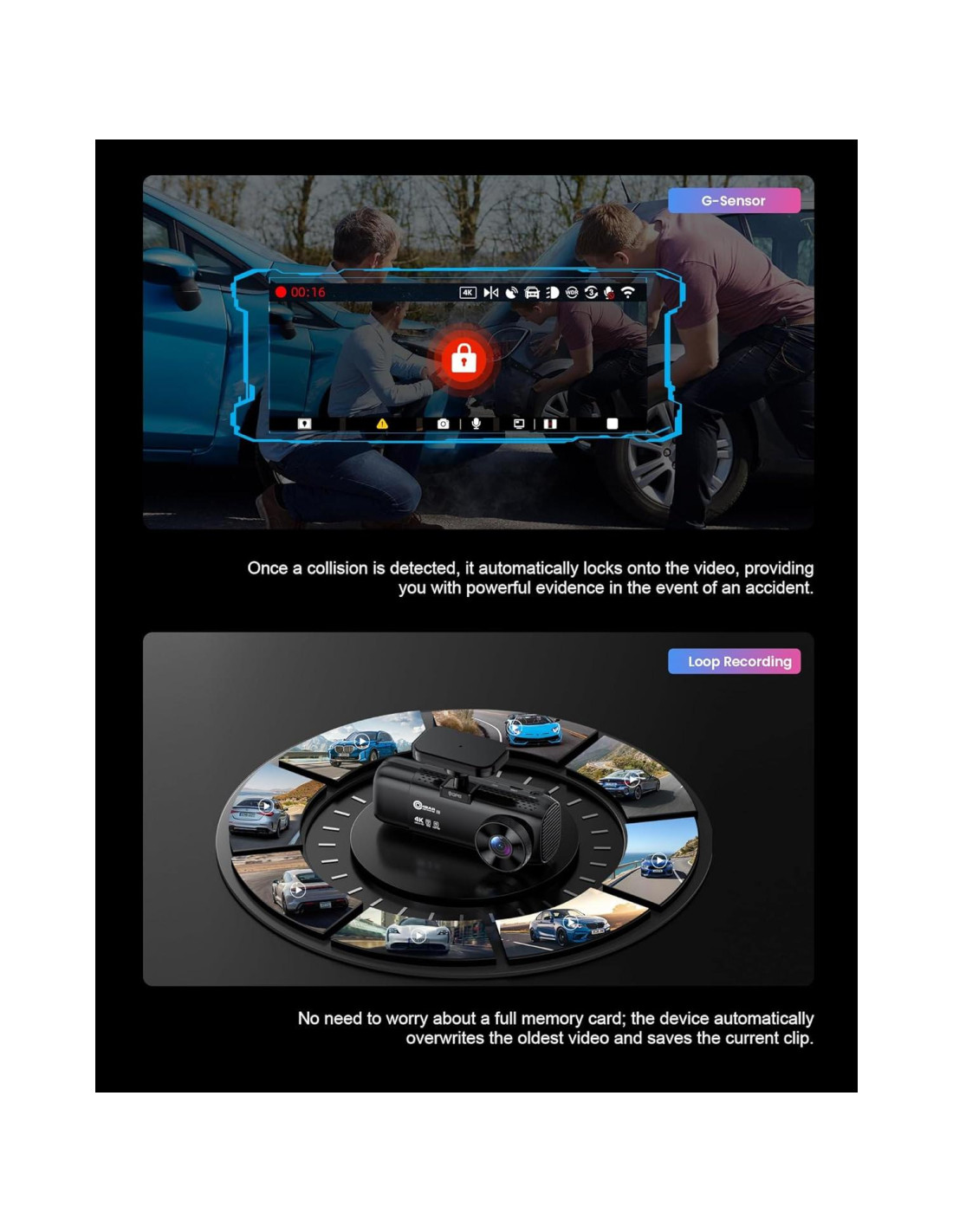 - Características especiales: Cámara de visión nocturna a todo color, STARVIS 2, sensor IMX678, 4K HDR, protección integral de 3 canales, LEDs IR, fácil de instalar, G-Sensor ajustable en 3 ejes, actualización de firmware OTA, supercapacitor, detección de movimiento con buffer, modo de estacionamiento 24 horas, soporte máximo de tarjeta de 512GB, visión nocturna, 360 grados, control por aplicación