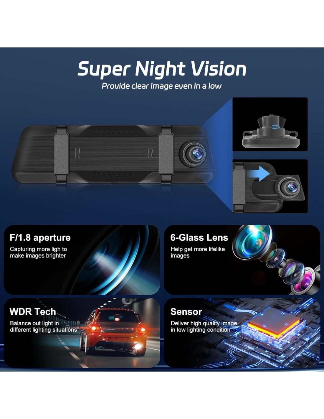 - "Visión Nocturna Superior y G-Sensor": La cámara de espejo delantera y trasera está equipada con un sensor superior, la cámara captura videos nítidos con detalles mejorados en condiciones de poca luz extrema. La tecnología de procesamiento dinámico HDR hace que la imagen sea más clara. La tecnología inteligente de anti-vibración evita que la imagen se difumine. El G-sensor detecta una colisión repentina y bloquea el metraje de la colisión.