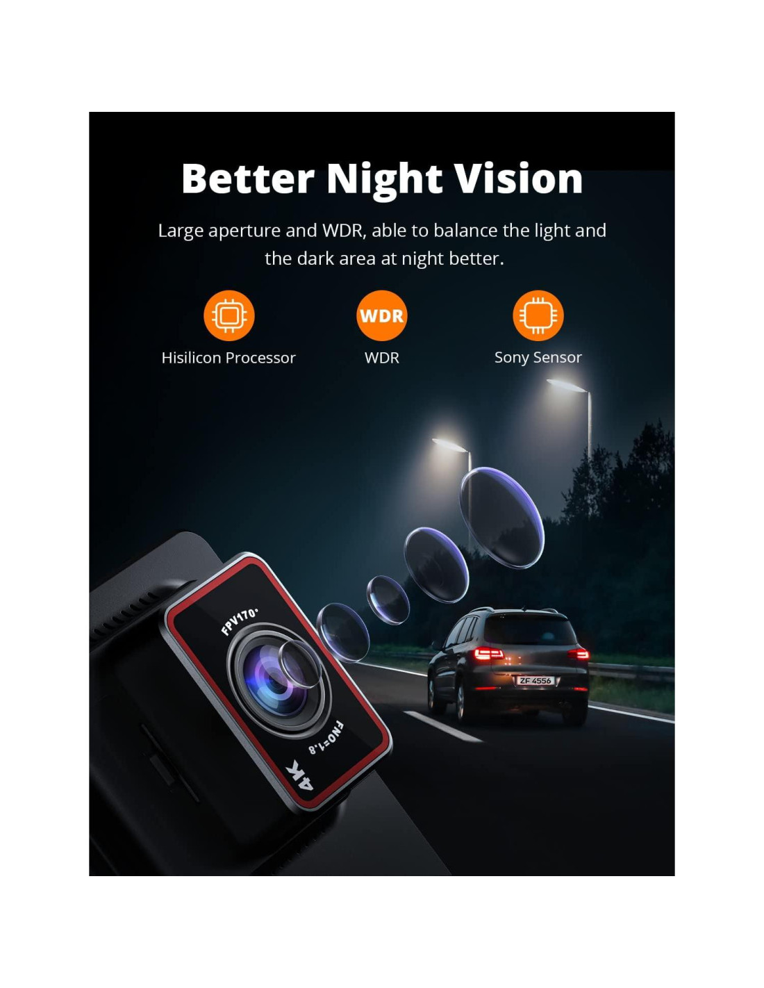 - VISIÓN NOCTURNA MÁS CLARA - La cámara de tablero Kingslim D4 adopta el sensor Sony STARVIS líder en la industria y el procesador Hisilicon para un mejor efecto de imagen. Además, con apertura f/1.8 y tecnología WDR, esta cámara de tablero puede grabar detalles impresionantes incluso en entornos con poca luz.