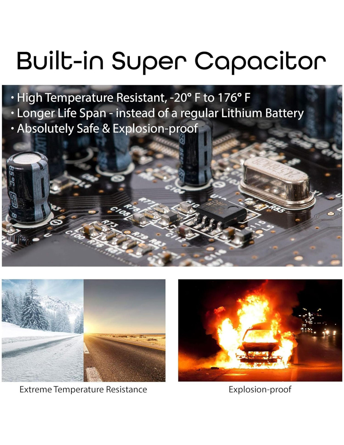 - SUPERCAPACITOR Y MONITOR DE ESTACIONAMIENTO: La energía se suministra con la ayuda de un supercapacitor, una alternativa premium a una batería de iones de litio que presenta una resistencia mejorada a temperaturas altas y bajas. Con la función de monitor de estacionamiento, la cámara de tablero se encenderá automáticamente y grabará cuando la cámara del automóvil detecte vibración O la cámara de tablero capturará fotogramas para un video en lapso de tiempo las 24 horas, los 7 días de la semana. Conéctate al kit de cableado inteligente para activar el modo de estacionamiento.