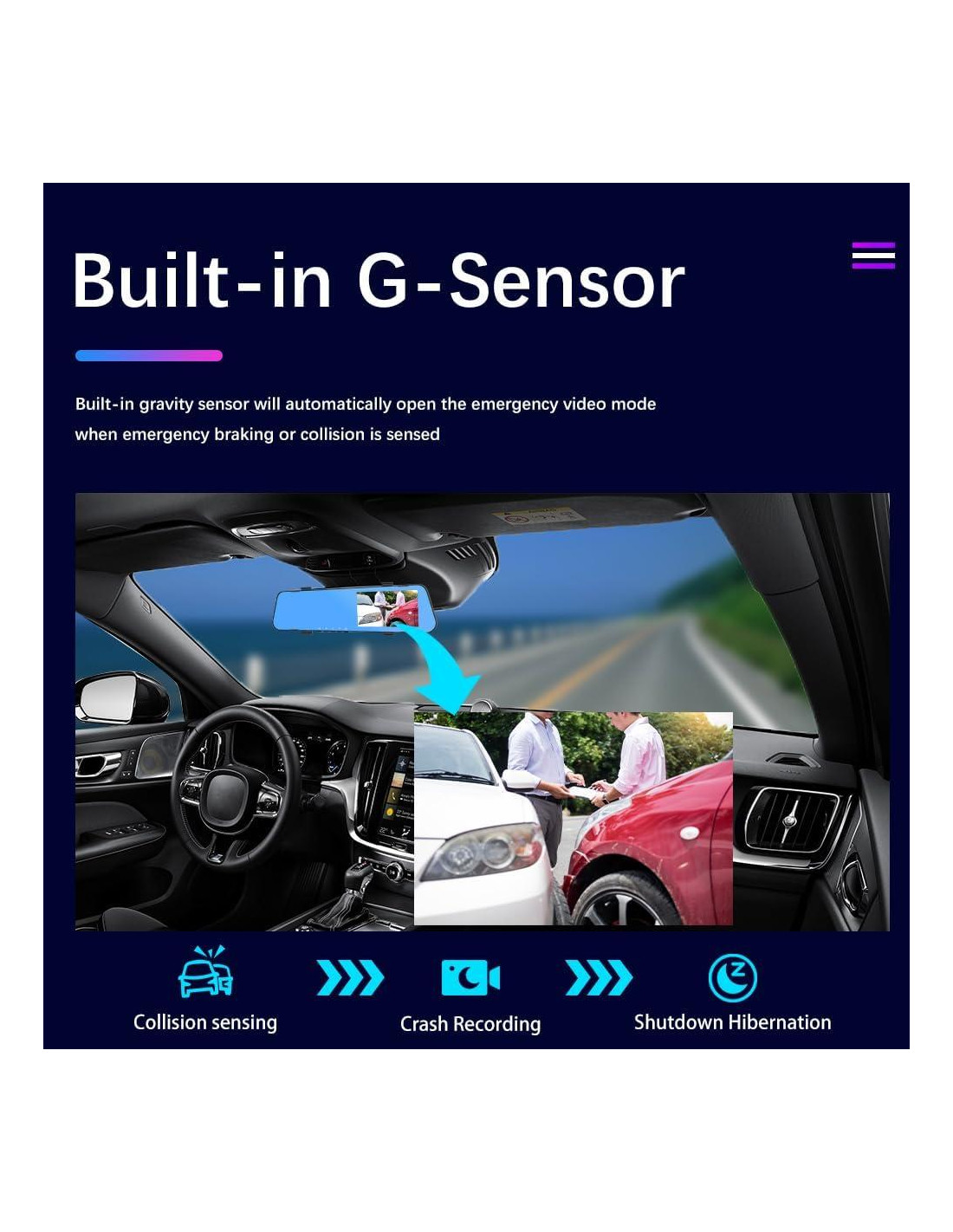 - [GRABACIÓN EN BUCLE & G-SENSOR] - Agrega una tarjeta TF externa, el dispositivo recibirá y sobrescribirá automáticamente el archivo antiguo, sin necesidad de eliminar manualmente los archivos de almacenamiento con frecuencia. Con G-sensor incorporado, cuando se detecta una colisión o golpe, la cámara de espejo se enciende automáticamente y comienza a grabar