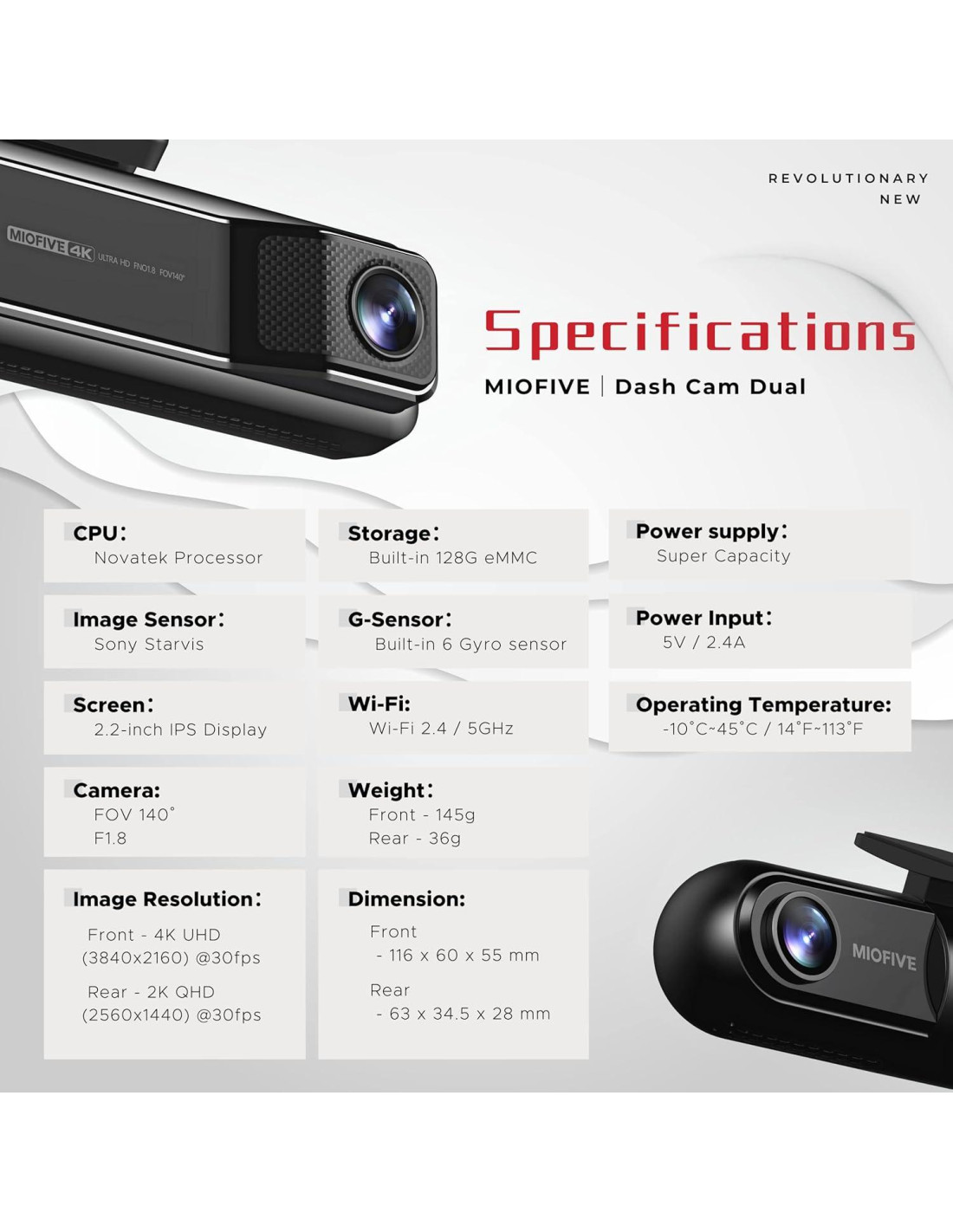 Lleva los viajes en automóvil al siguiente nivel con el sistema de cámara de tablero delantera y trasera Miofive con resoluciones 4K + 2K. Una adición imprescindible a la electrónica de vehículos, esta cámara de tablero para automóviles utiliza algoritmos de IA de vanguardia, visión nocturna y detección de movimiento para proteger tu carga más preciada. Captura imágenes frente a ti y detrás de ti con ángulos de visión ultra amplios, un campo de color más grande y una cámara trasera para que nunca te pierdas un momento de tus épicas travesías por carretera. Las imágenes se graban y se guardan en el almacenamiento eMMC de 128G incorporado. Utiliza la conectividad wifi 5G y la aplicación Miofive para ver en vivo el viaje y obtener más sonrisas por milla.