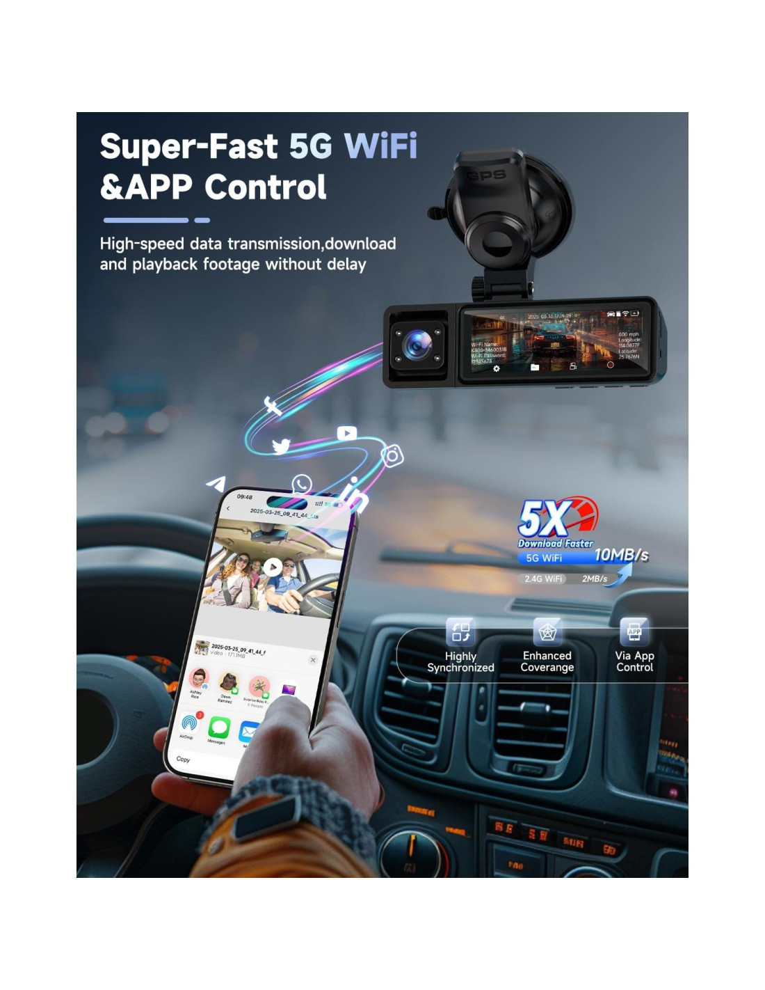 - [Cámara de Salpicadero Inalámbrica con GPS y WIFI 5.8G] La cámara de salpicadero K800 3-Canal es compatible con la APP OVAMAN y GPS, lo que te permite acceder instantáneamente a películas y grabar rutas en tu teléfono. Con WiFi 5G, puedes disfrutar de una transferencia de datos inalámbrica más rápida y compartir videos de manera conveniente mientras estás en movimiento. Reproduce simultáneamente videos de la cámara de salpicadero de 3 vías, monitorea sin esfuerzo métricas de video y obtén datos GPS en tiempo real como evidencia en accidentes. Además, puedes ver registros GPS en la aplicación o reproducirlos en tu PC.