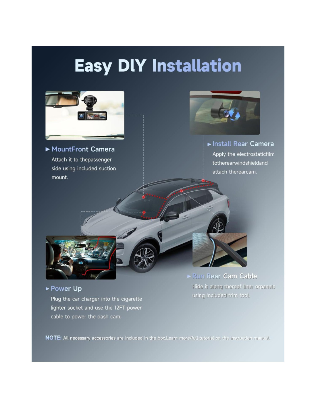 - Qué hay en la caja: 1*Mini Cámara de Salpicadero WIFI con Tarjeta de 64GB, 1*Cámara Trasera+1*Cámara Interior, 1*Manual del Usuario+1*Tarjeta de servicio postventa, Cargador de Coche, Herramienta de Instalación
