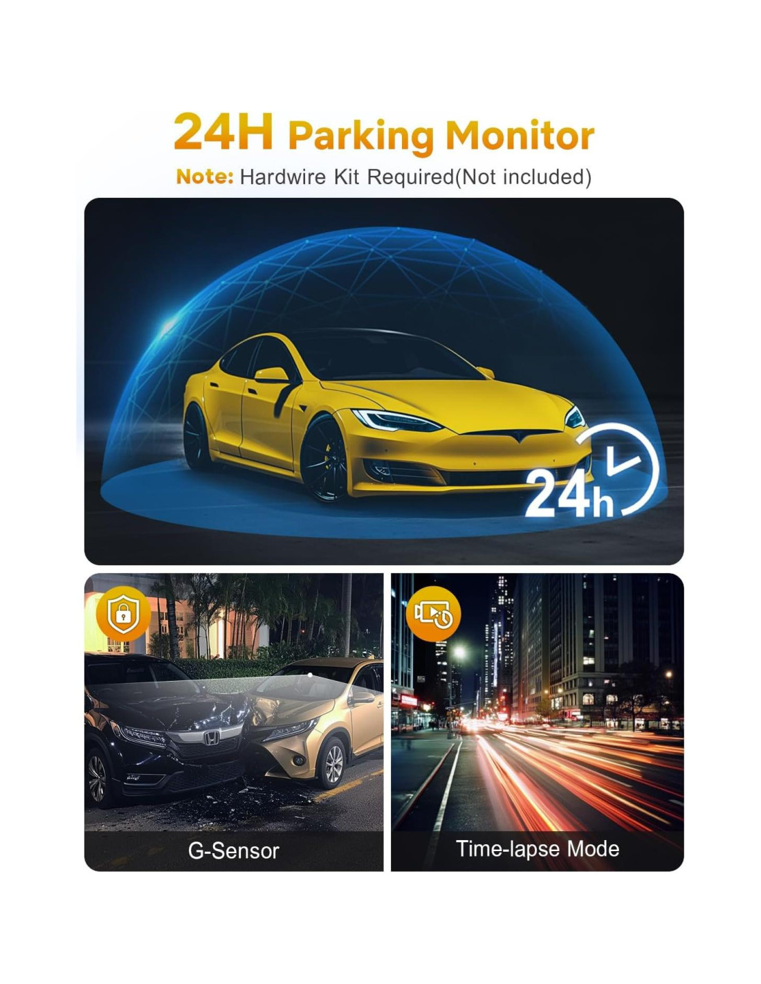 - [Modo de Estacionamiento de 24 Horas] Esta cámara dash para automóviles soporta modo de estacionamiento de 24 horas y detección de impactos. Mientras tu vehículo está estacionado, la cámara dash graba automáticamente el metraje, proporcionando evidencia valiosa y tranquilidad adicional. Ten en cuenta que el kit de cableado no está incluido en el paquete, por favor contáctanos para obtenerlo.