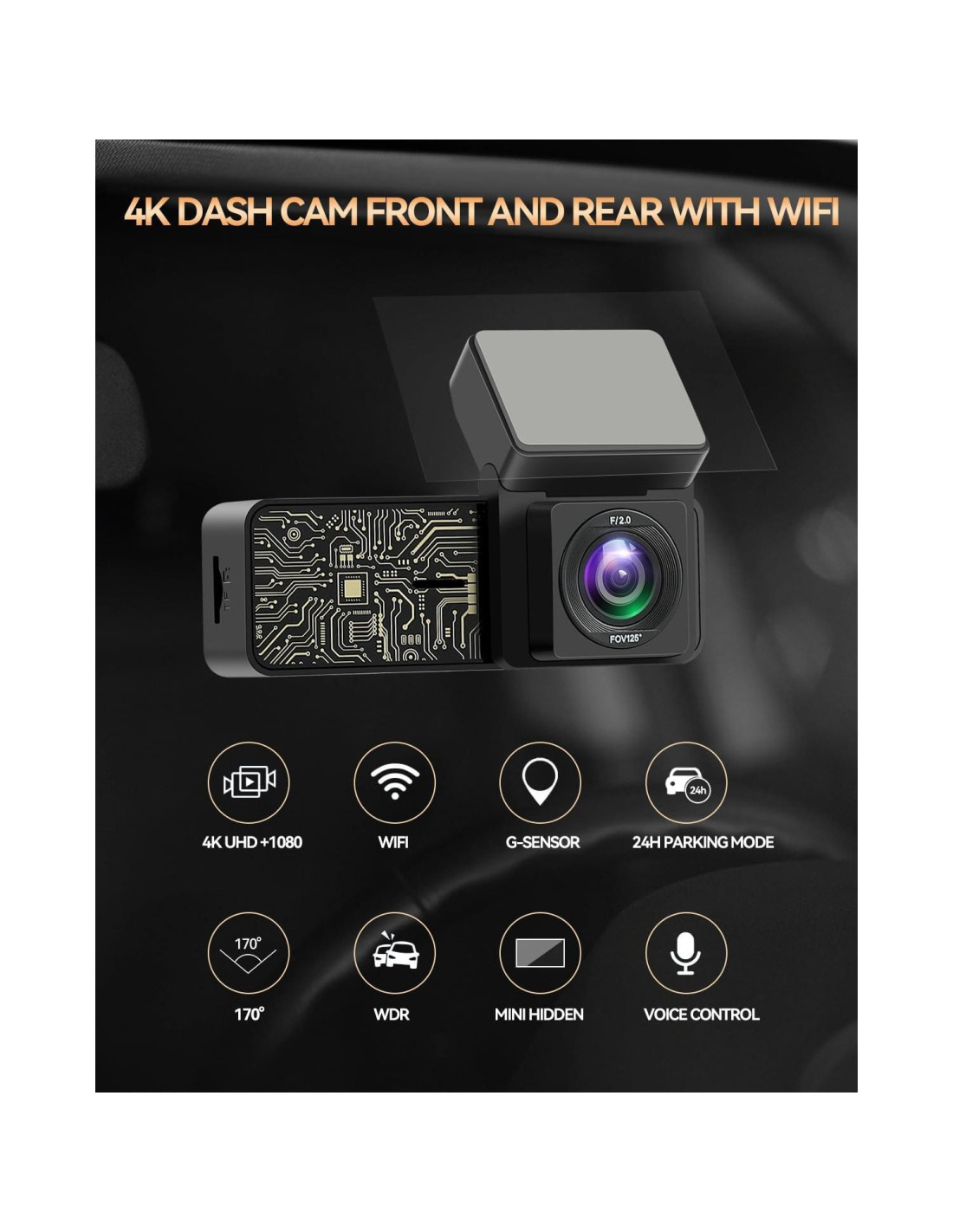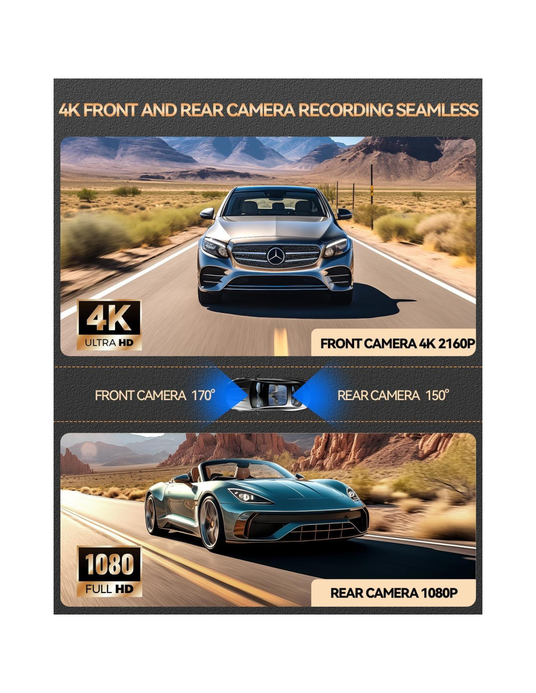- Características especiales: Cámara Dash 4K Delantera y Trasera, Cámara Dash WiFi Integrada, Monitor de Estacionamiento 24H G-sensor, Grabación en Bucle Time-lapse, Cámara de Auto con Control por Voz