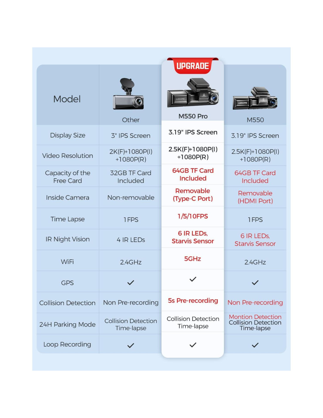- Soporte: La cámara de salpicadero triple AZDOME M550 Pro incluye una tarjeta de 64GB. Para accesorios adicionales, comuníquese con el equipo de soporte de AZDOME para obtener asistencia. AZDOME proporciona soporte al cliente 12 meses y 24/7. Para consultas sobre el producto o asistencia técnica, nuestro equipo de postventa siempre está listo para ayudarle.