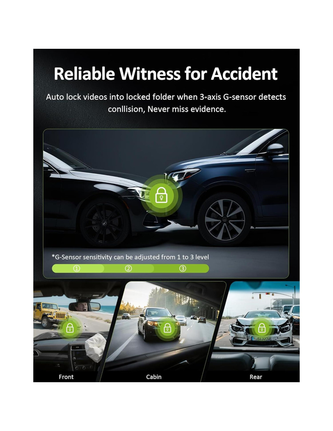 - [Monitor de estacionamiento 24/7 - ¡Protege tu coche incluso cuando estás ausente!] (Requiere kit de cableado para alimentación continua - se vende por separado) La cámara de tablero de 3 canales con monitor de estacionamiento incorporado detecta impactos mientras está estacionada, grabando automáticamente actos de vandalismo, robos o accidentes. Las imágenes críticas se bloquean y guardan, por lo que siempre tendrás evidencia, sin importar cuándo surja el problema