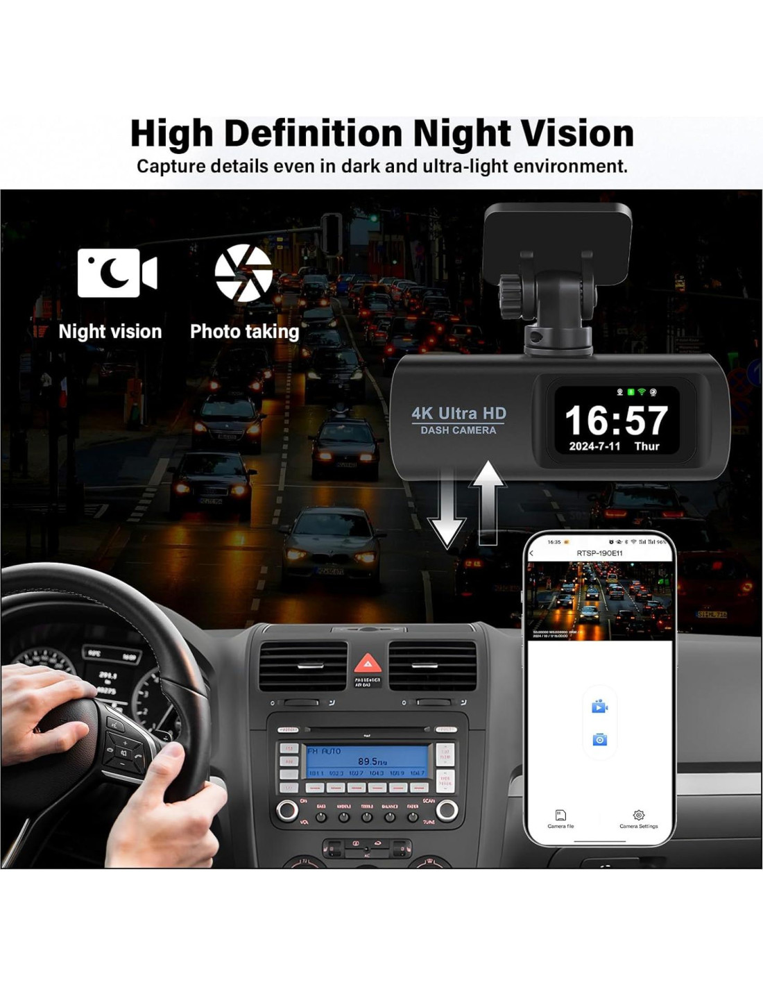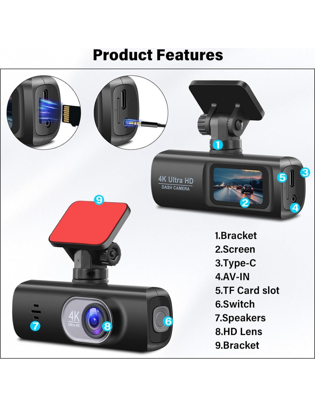 - Características especiales: WiFi incorporado, Control de APP inalámbrico, Cámara de Salpicadero Dual, 4K UHD Delantera y 1080P Trasera, Grabación en Bucle y Función de Sensor G, Tarjeta SD de 64GB, Tipo-C, Aux-in, Asistencia de Estacionamiento, Monitoreo de Estacionamiento Brillante, Super Visión Nocturna y Condiciones Climáticas Extremas