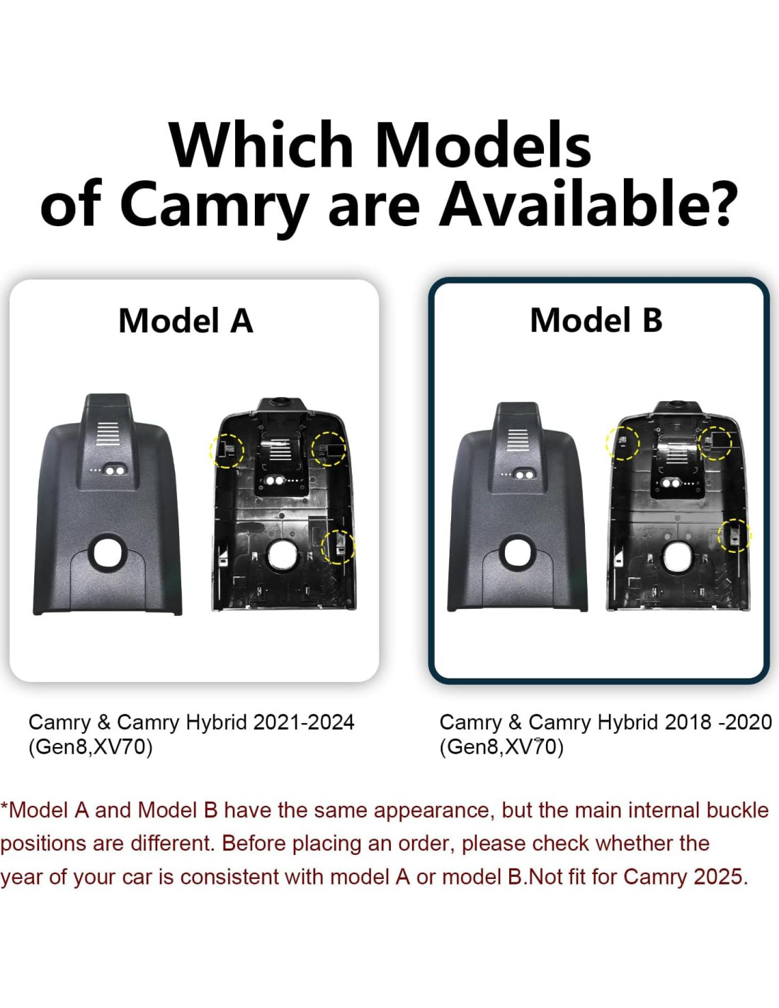 - Por favor, verifica el modelo cuidadosamente: El Modelo A y el Modelo B tienen la misma apariencia, esto puede hacernos elegir la cámara dash incorrecta. Primero, es necesario confirmar el año del Camry, (Modelo A) adecuado para Camry 2021, 2022, 2023, 2024; (Modelo B) adecuado para Camry 2018, 2019, 2020. En segundo lugar, la principal diferencia es que las posiciones de los broches internos son diferentes. La posición indicada por el círculo amarillo. Si aún no estás seguro de qué modelo es adecuado para el estilo de tu vehículo, por favor contáctanos.