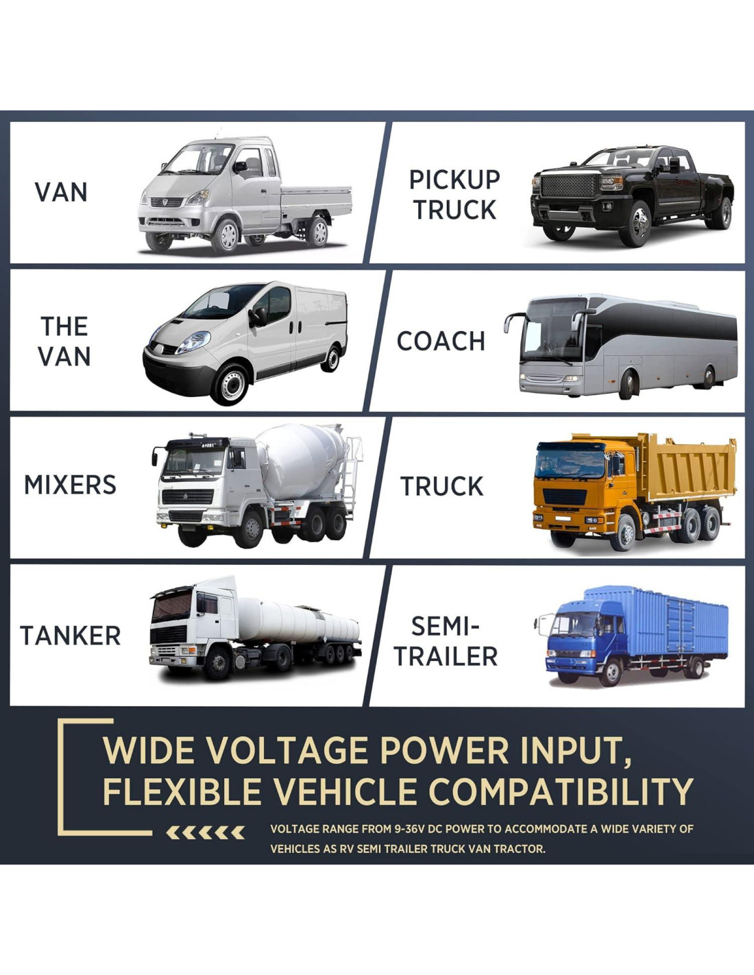 - [Compatibilidad Flexible con Vehículos] - Rango de voltaje de 9-36V DC para acomodar una amplia variedad de vehículos como RV Camión Remolque Clase A Camión de caja camión semirremolque Remolque de viaje Remolque de caballos Autobús Autobús escolar Camper de servicio pesado Tractor, el 5to Rueda, casas rodantes, etc.