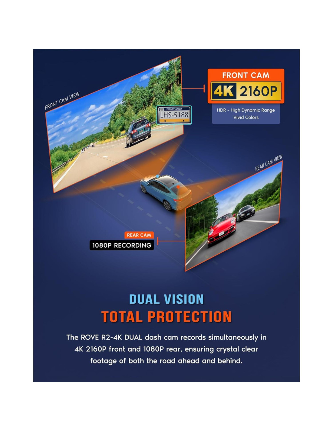 - GRABACIÓN FRONTAL 4K + TRASERA 1080P - La cámara dash ROVE R2-4K DUAL ofrece capacidades de grabación de doble canal, capturando imágenes simultáneamente desde las cámaras frontal y trasera. La cámara frontal graba a 3840x2160P @30fps, mientras que la cámara trasera captura imágenes a 1920x1080P @30fps, asegurando grabaciones claras de la carretera delante y detrás de ti. Con un ángulo ultra amplio de 150 para la cámara frontal y un ángulo de 140 para la cámara trasera, capturarás más de la carretera con esta cámara dash 4k.