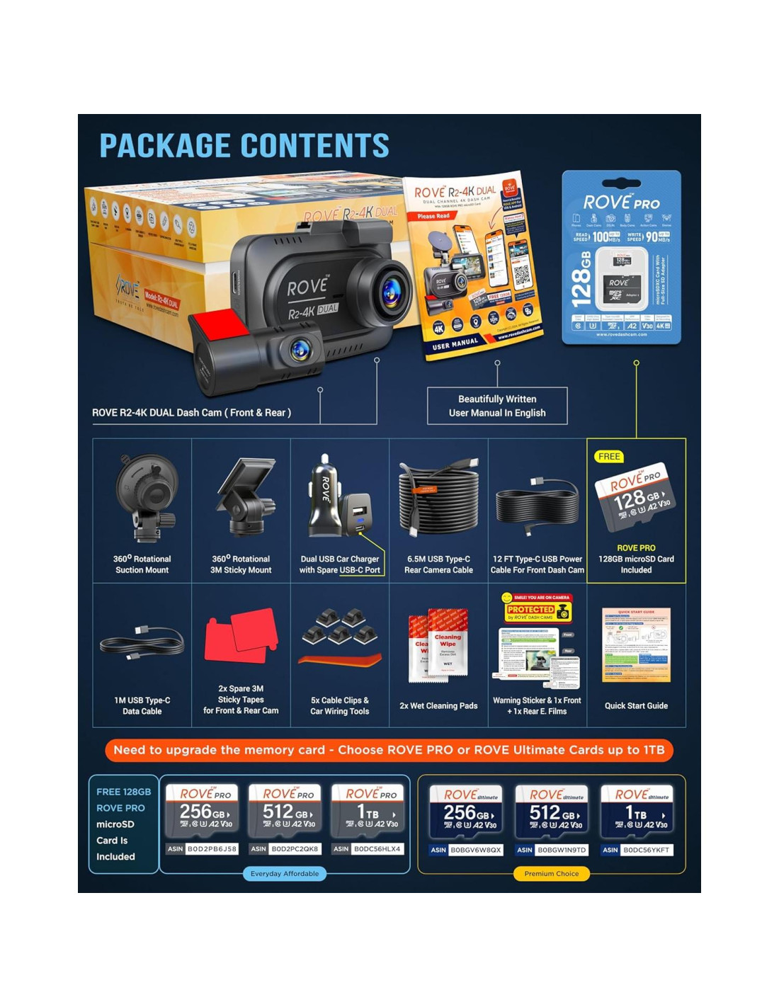 - Contenido de la caja: 1x Cámara Dash R2-4K DUAL, 1x Cámara Trasera, 1x Tarjeta microSD ROVE PRO de 128GB, 1x Cargador de Auto USB Doble Rápido, 1x Soporte de Succión para Parabrisas, 1x Soporte Adhesivo 3M, 1x Manual del Usuario, 1x Guía de Inicio Rápido & 1x Tarjeta de Garantía, 1x Cable de Alimentación USB-C de 3.5M, 1x Cable de Datos USB-C de 1M, 1x Cable de Extensión para Cámara Trasera de 6.5M, 5x Clips de Cable, 1x Herramienta de Recorte de Cable, 2x Cintas Adhesivas, 2x Películas Electroestáticas, 2x Paños de Limpieza Húmedos