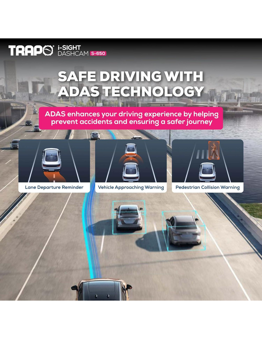 ¿En qué resolución graba la cámara dash Trapo i-Sight S-650? La cámara S-650 graba videos nítidos en resolución 2K (2560 x 1440p) con HDR, capturando matrículas, señales de tráfico y detalles faciales claramente tanto de día como de noche. ¿La cámara S-650 soporta vigilancia de estacionamiento? Sí, la S-650 cuenta con monitoreo de estacionamiento 24/7. Graba continuamente a 1 fotograma por segundo (FPS), capturando eventos incluso cuando tu auto está estacionado, mientras conserva espacio en la tarjeta de memoria. ¿Puedo conectar esta cámara dash directamente a mi smartphone? Absolutamente. La S-650 viene con Wi-Fi integrado, permitiendo conexión instantánea a tu smartphone para fácil reproducción, gestión de configuraciones y visualización de imágenes en tiempo real a través de la aplicación Trapo. ¿Qué características de seguridad avanzadas incluye la cámara S-650? La S-650 incluye Sistemas Avanzados de Asistencia al Conductor (ADAS) como Alertas de Salida de Carril, Alertas de Inicio de Vehículo Frontal y Alertas de Colisión con Peatones, proporcionando notificaciones en tiempo real para mejorar la seguridad del conductor. ¿Cómo protege la cámara S-650 las grabaciones durante un accidente? Equipado con un G-Sensor, la cámara dash detecta automáticamente impactos repentinos, colisiones o giros bruscos y bloquea de forma segura las grabaciones para evitar que sean sobrescritas. Cámara Dash Trapo S650 Cámara Dash Trapo S550 Kit de Cableado TRAPO Tipo-C Limpiaparabris Hidro de 22" (55.88 cm) Limpiaparabris Hidro de 26" (66.04 cm) Limpiaparabris Hidro de 28" (71.12 cm)