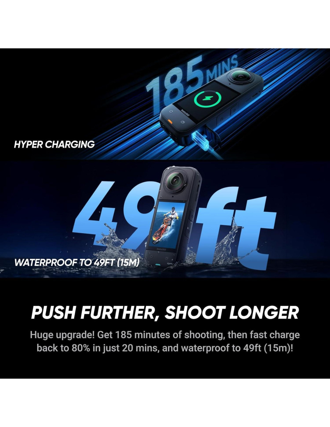 - Captura 360 grados con 8K: con video 8K 360 y rendimiento mejorado en condiciones de poca luz para grabaciones durante todo el día y desde todos los ángulos. Audio mejorado, batería de 185 minutos de duración, y lentes mejoradas reemplazables por el usuario con resistencia a rayones de nivel vidrio de zafiro hacen de esta la cámara 360 más duradera hasta ahora.