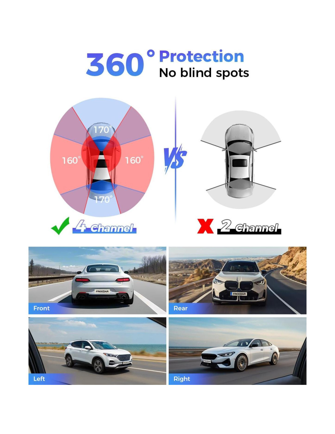 - REALMENTE SIN PUNTOS CIEGOS - El FREEXAR D4 redefine la seguridad de las cámaras dash con 4 lentes ajustables que ofrecen una vista real de 360 - capturando el frente, la parte trasera, la izquierda, la derecha y el interior todo a la vez. La mayoría de las cámaras dash solo muestran la carretera delante y detrás. Pero más del 90% de las disputas comienzan en el punto ciego. Lo cubrimos todo, porque la tranquilidad comienza con ver todo.