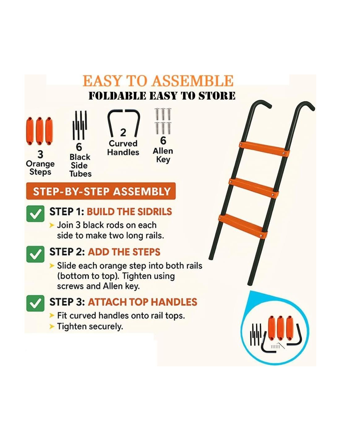- Montaje rápido y fácil, sin esfuerzo adicional requerido. Diseñada para seguridad y comodidad, esta escalera de trampolín de 3 pasos cuenta con pasos robustos y antideslizantes que ofrecen un fuerte agarre en todas las condiciones climáticas, haciéndola perfecta para niños y adultos por igual.