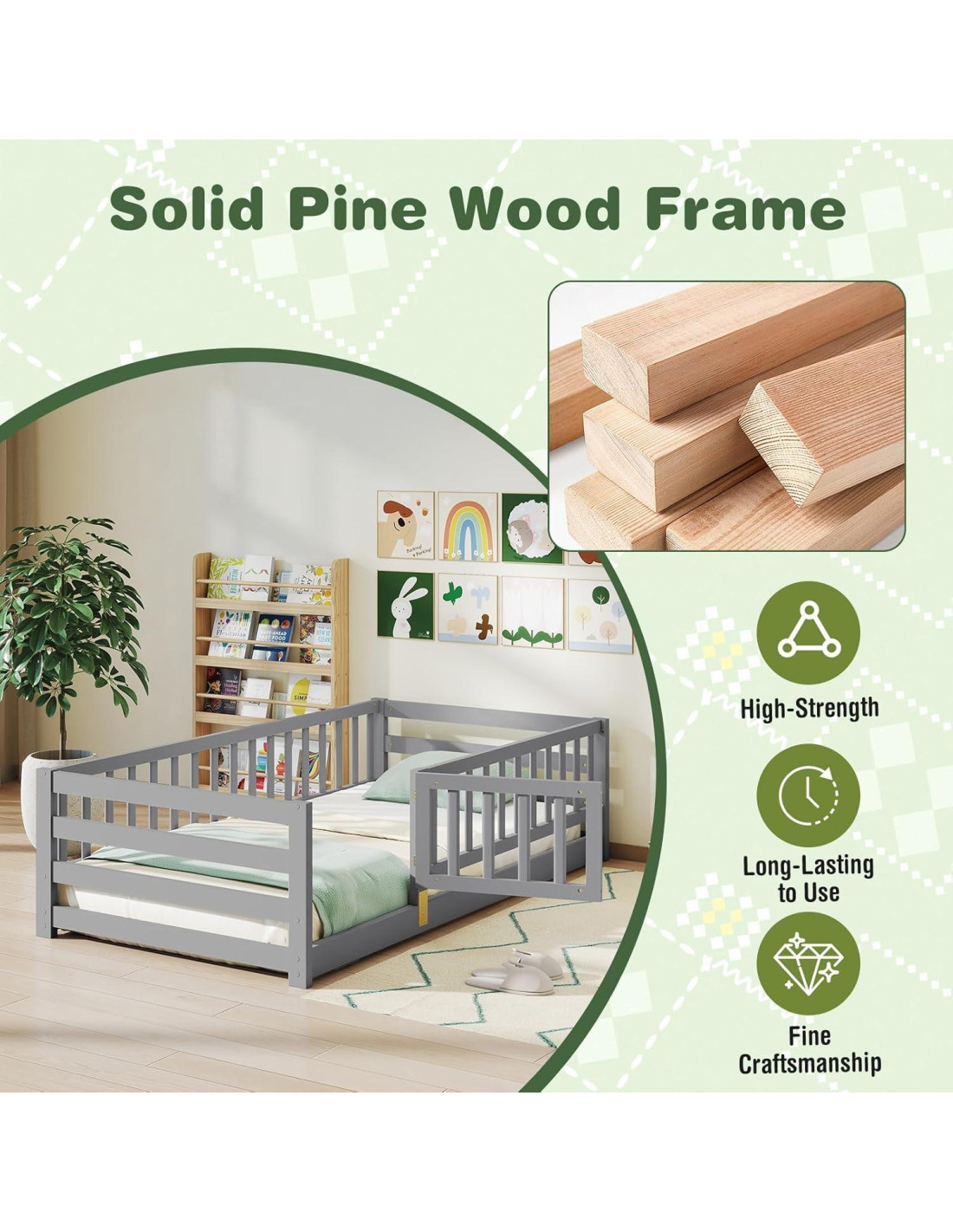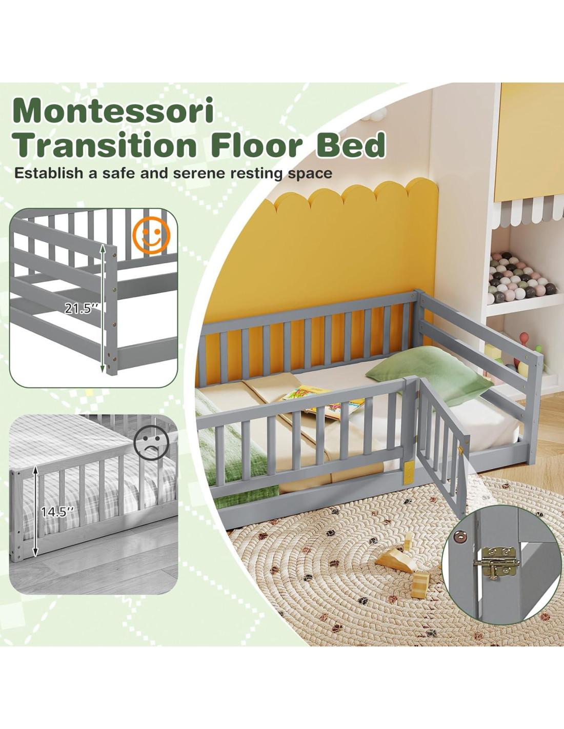- Seguridad Mejorada: Equipado con barandas de seguridad elevadas de 21.5 pulgadas (54.6 cm) de altura, la cama de suelo ofrece tranquilidad al establecer un espacio de descanso seguro y sereno para tu hijo. Estas altas barandas añaden protección adicional, asegurando un sueño seguro cada noche.