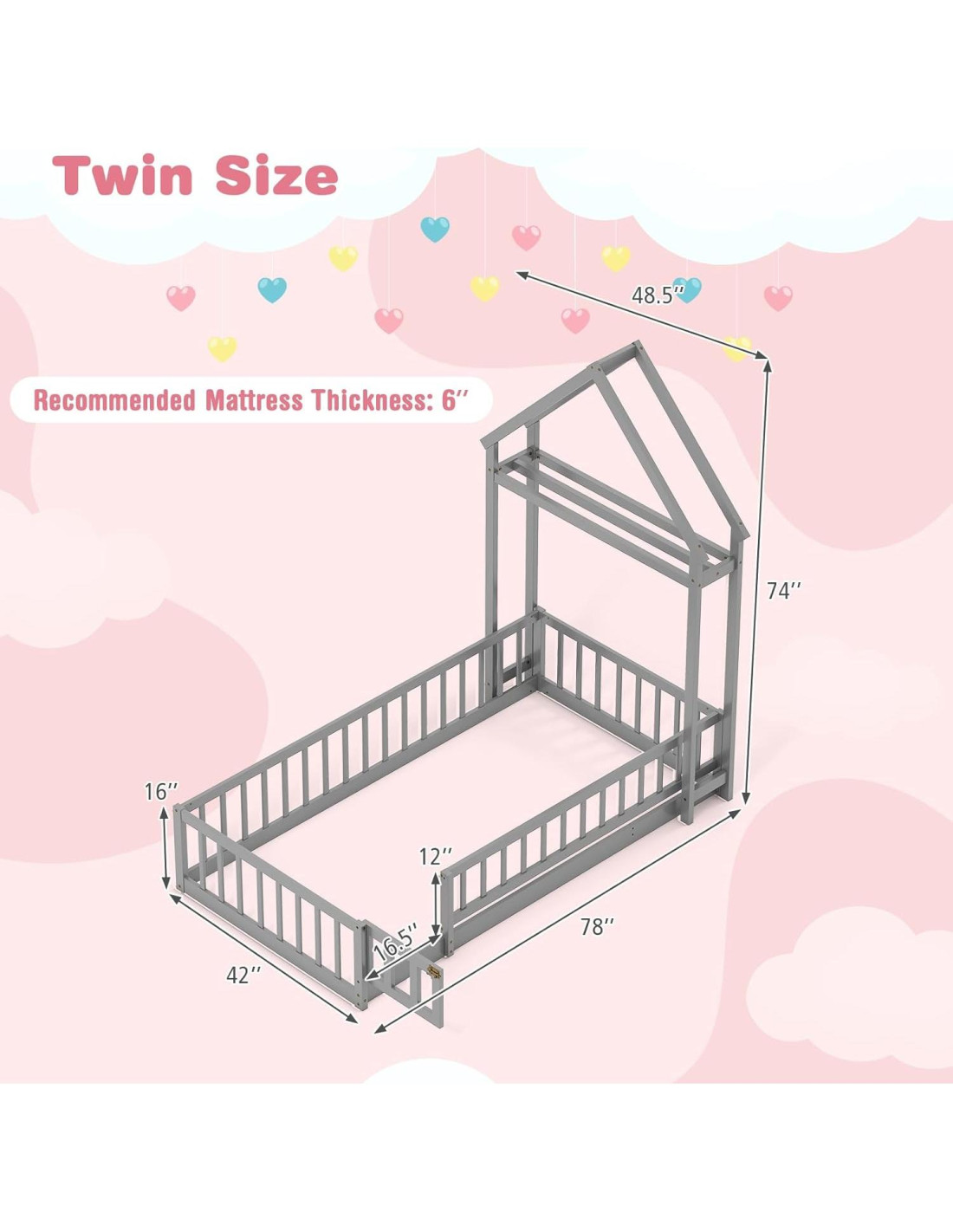 Descripción: ¡Convierte el dormitorio de tu hijo en un espacio lúdico! Con una encantadora cabecera en forma de casa, la cama de piso de tamaño doble añade un toque caprichoso a cualquier decoración de habitación. Además, este marco de cama de madera está diseñado sin listones para sentarse directamente en el suelo, abrazando el principio Montessori de accesibilidad y autosuficiencia. La puerta abierta con cerradura facilita entrar y salir de la cama por sí mismos, mientras que las barandillas altas garantizan tranquilidad. Para mayor comodidad, el perchero se puede instalar en el lado de la cama o fijarse a la pared, proporcionando una solución práctica para organizar atuendos o disfraces. Esta cama Montessori no solo sirve como un acogedor espacio para dormir, sino que también se convierte en un posible área de juego durante el día. Características: Cabecera en forma de casa añade diversión y encanto a la habitación de tu hijo Decora el techo con tiras de luces, cintas y cortinas La cama de piso Montessori fomenta la independencia y la autosuficiencia Diseño bajo hace que sea fácil entrar y salir de la cama El perchero se puede colocar en el lado de la cama o fijar a la pared Barandillas de seguridad de 30.5 cm para una zona de sueño segura La puerta abierta se puede instalar en el lado izquierdo o derecho de la cama Puerta con cerradura y pestillo mejora la seguridad y fiabilidad Mayor construcción de madera garantiza gran durabilidad y estabilidad Se necesita ensamblaje Especificaciones: Color: Gris/Natural/Rosa/Blanco Material: Madera de Pino, Contrachapado Dimensiones Generales: 198 cm x 123.2 cm x 187.96 cm (L x W x H) Dimensiones de la Cama: 198 cm x 106.68 cm x 40.64 cm (L x W x H) Dimensiones de la Entrada: 41.91 cm x 30.48 cm (L x W x H) Altura de las Barandillas: 30.48 cm Grosor de Colchón Recomendado: 15.24 cm (no incluido) Peso Neto: 19.96 kg Nota: Las decoraciones no están incluidas. 1 x Cama de Piso en Forma de Casa 1 x Instrucción