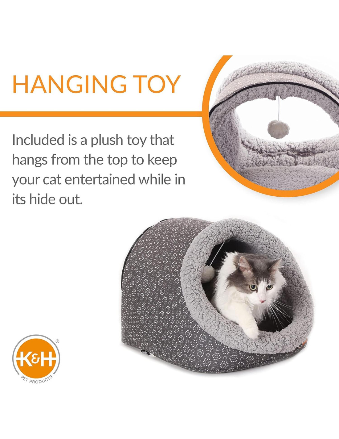 La Cueva Térmica para Mascotas de K&H Productos para Mascotas está disponible en versiones calentada y no calentada. ¡Es una cueva para gatos, es un túnel para gatos, ¡es ambas cosas! Esta cama para gatos única tiene una puerta trasera que se puede dejar sin cerrar para los gatos que prefieren túneles. La Cueva para Gatos está diseñada para ofrecer un lugar acogedor para que los gatos se escondan y duerman. El interior está completamente cubierto de suave forro polar y también incluye un juguete de peluche colgante que se puede usar para jugar y golpear. El exterior de esta cama premium para gatos está cubierto de suave poliéster lujoso. Toda la cama para gatos es lavable a máquina (versión calentada: retire primero el calentador listado MET de 4 vatios). La seguridad es nuestra prioridad en K&H; no solo usamos piezas listadas para seguridad, certificamos todo el producto para garantizar su seguridad - La versión calentada de esta cama para gatos ha sido probada y certificada por MET Labs y supera los estándares de seguridad eléctrica de EE. UU./CA. Un año de garantía limitada.