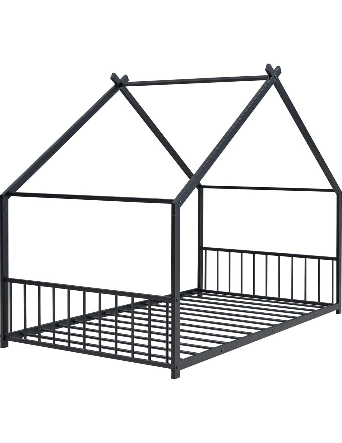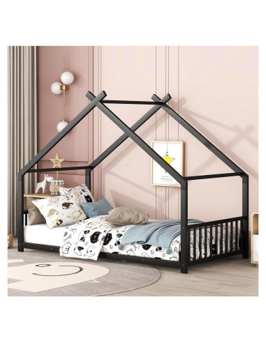 Nuestra cama Montessori de metal negra de tamaño twin con un encantador diseño de techo transforma la habitación de su hijo en un refugio que combina imaginación. La estructura semi-cerrada crea una atmósfera acogedora, similar a una cueva, que conforta a los niños mientras promueve la circulación de aire para un sueño pacífico. Fabricada con un resistente marco de metal e incluye listones, esta cama soporta colchones twin sin necesidad de base de colchón, asegurando durabilidad para el juego activo y el uso diario, ideal para niños y niñas enérgicos. El diseño de perfil bajo inspirado en Montessori permite un fácil acceso para entrar y salir, fomentando la independencia, mientras que el acabado negro elegante complementa cualquier decoración, desde temas modernos hasta caprichosos. El ensamblaje es muy sencillo, con todo el hardware e instrucciones claras incluidas en una caja, facilitando la tarea a padres ocupados o inquilinos. Con unas medidas de 197.0 cm de largo x 102.9 cm de ancho x 145.0 cm de alto, esta cama ofrece amplio espacio para dormir y explorar creativamente, ya sea utilizada como un acogedor rincón en la habitación de un niño o como una solución que ahorra espacio en un apartamento pequeño. Diseñada para inspirar imaginación e independencia, esta cama tipo casa es más que un mueble, es un santuario donde los niños pueden dormir y crecer con comodidad.