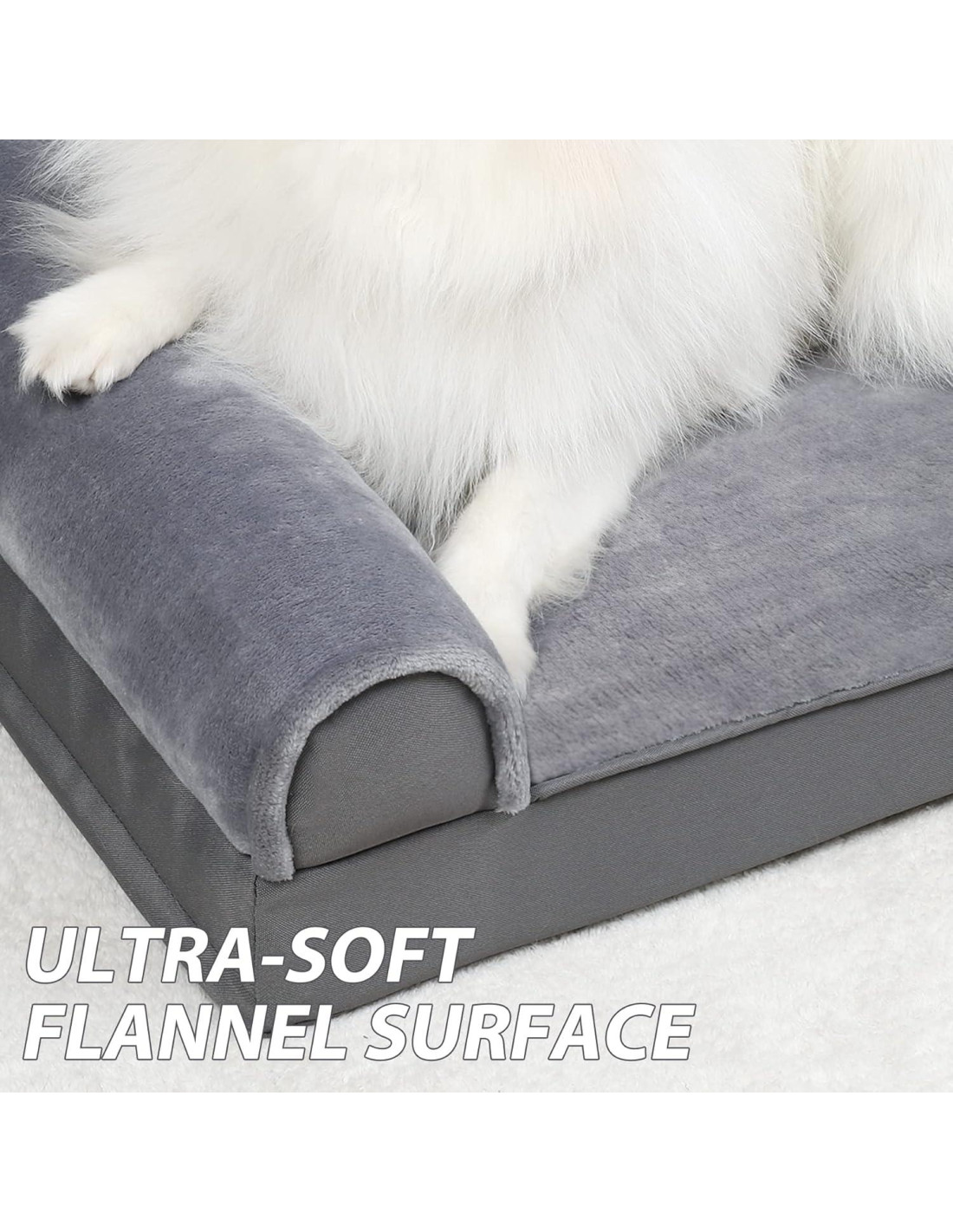 - Ultra-suave e Impermeable - El área de descanso de la cama ortopédica para perros está hecha de tela de 3 capas. La superficie de franela es suave y amigable con la piel. La capa intermedia de TPU impermeable previene la penetración de líquidos, por lo que la espuma no se mojará. El forro de tela de punto interior es lo suficientemente duradero para un uso prolongado. Los refuerzos también están envueltos en suave franela para mayor comodidad.
