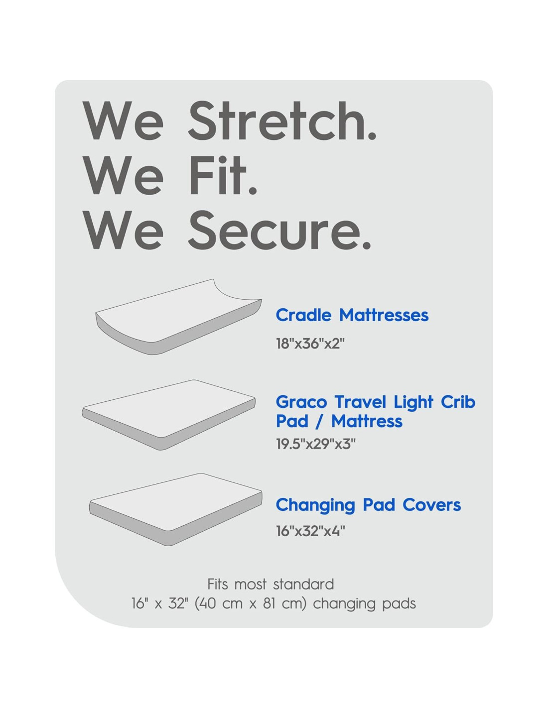 - AJUSTE CEÑIDO DE 360: Mantén a tu bebé seguro y acogedor con nuestras fundas de cambiador. Con sus esquinas elásticas fáciles de usar, estas fundas son muy fáciles de poner y quitar, haciendo que la hora de dormir sea un placer. Estas fundas de cambiador para bebés cuentan con un elástico de 360 que se estira a lo largo de todo el borde inferior, ayudando a evitar que se deslicen sobre el colchón. Esto asegura un ajuste más seguro y ceñido que mantiene a tu bebé cómodo toda la noche.