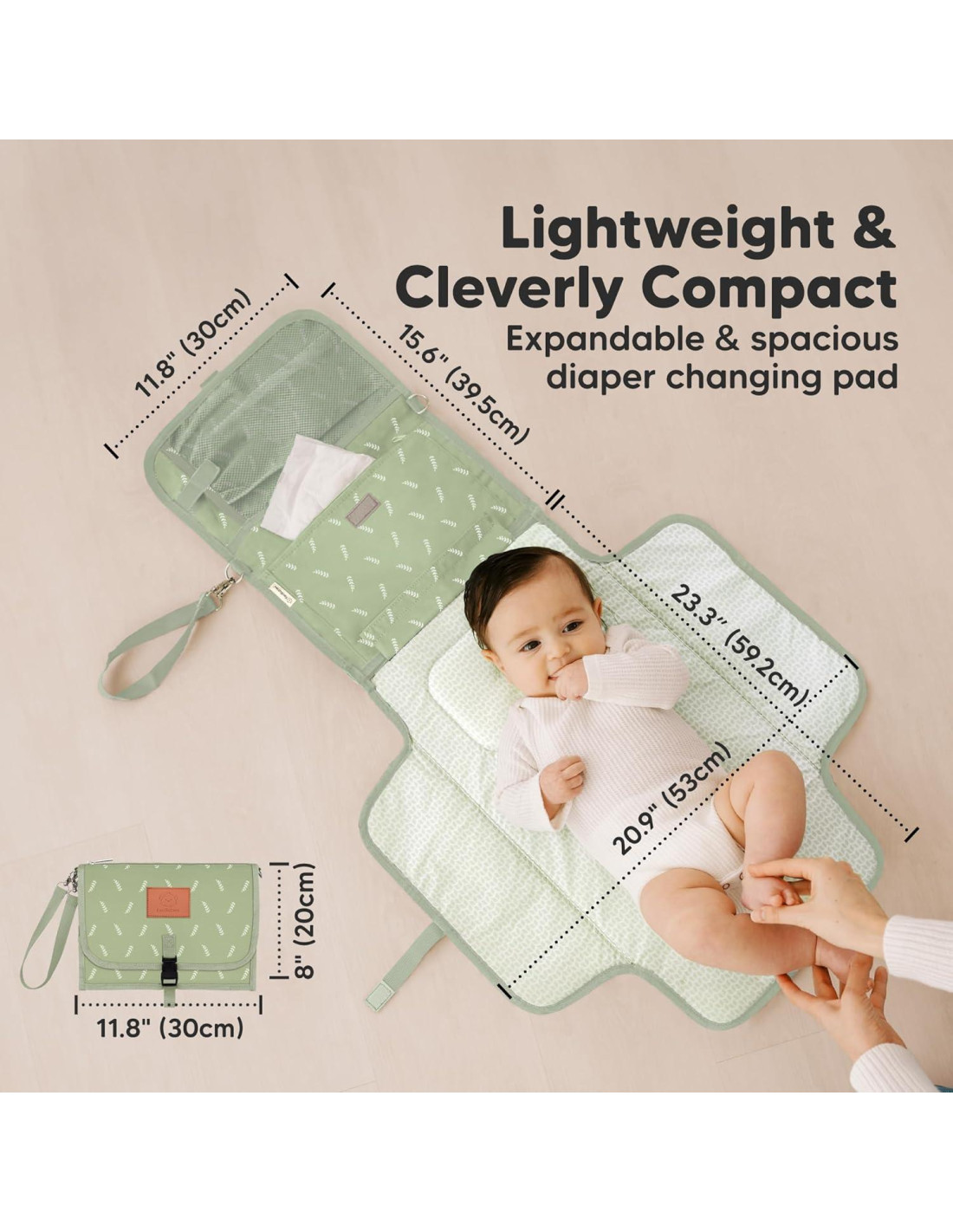 - Almohadilla de Cambio de Pañales Grande Plegable - Cuenta con un área de cambio de pañales grande de 23.3" (59.2cm) por 20.9" (53cm). Nunca tendrás que preocuparte por cambiar a tu bebé en una estación de cambio de pañales pública. ¡Plegable en un clutch de pañales para uso en movimiento!