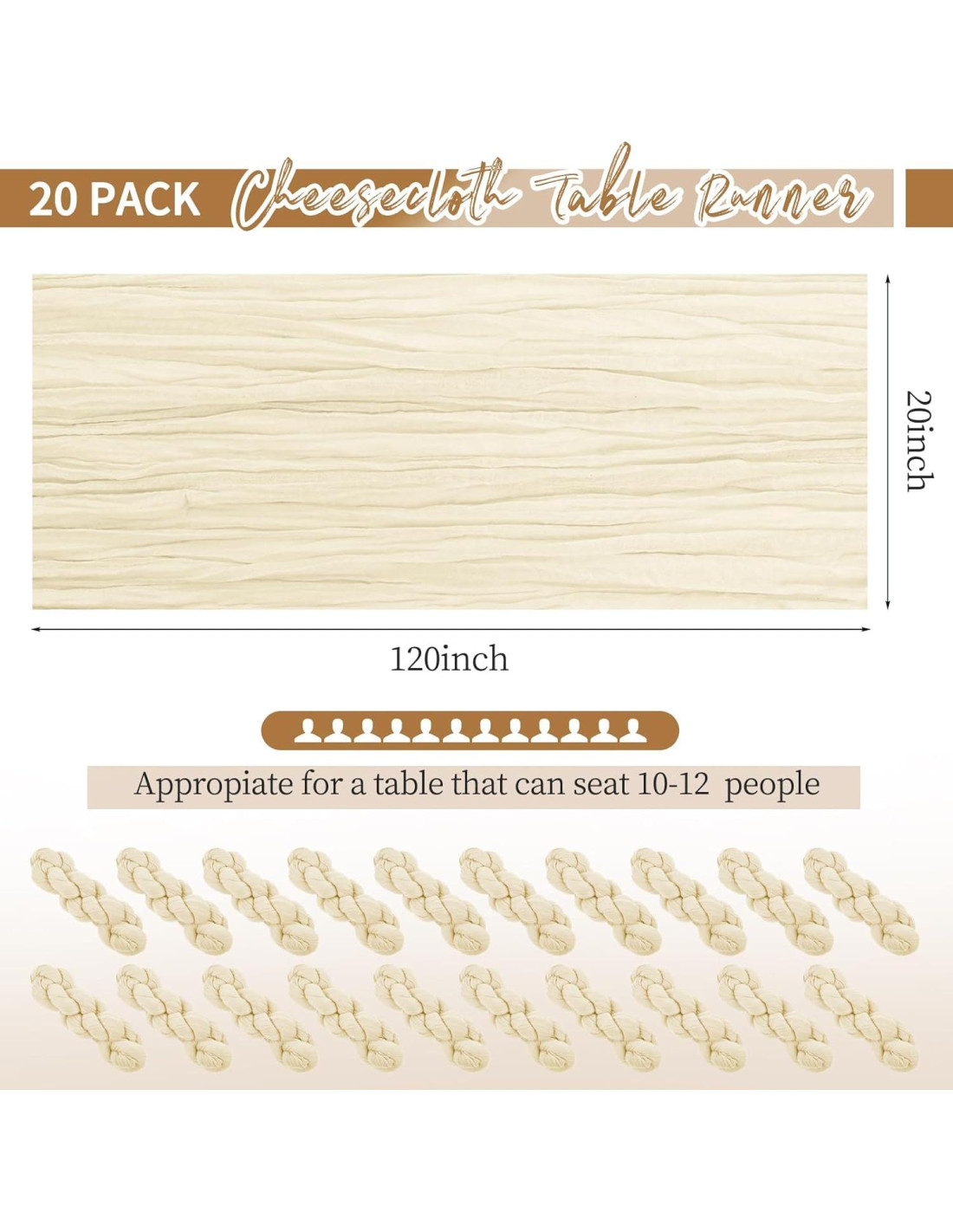 - Paquete Incluido: Obtendrás 20 caminos de mesa de gasa de queso marfil, la cantidad suficiente es adecuada para banquetes de bodas y varias fiestas, el tamaño de cada camino de mesa es aproximadamente 20 x 120 pulgadas (50 x 300 cm), lo que es lo suficientemente grande para cubrir mesas rectangulares y redondas, adecuado para mesas que pueden sentar de 8 a 10 personas. El camino de mesa marfil tiene una textura arrugada natural, que impresionará a tus invitados.