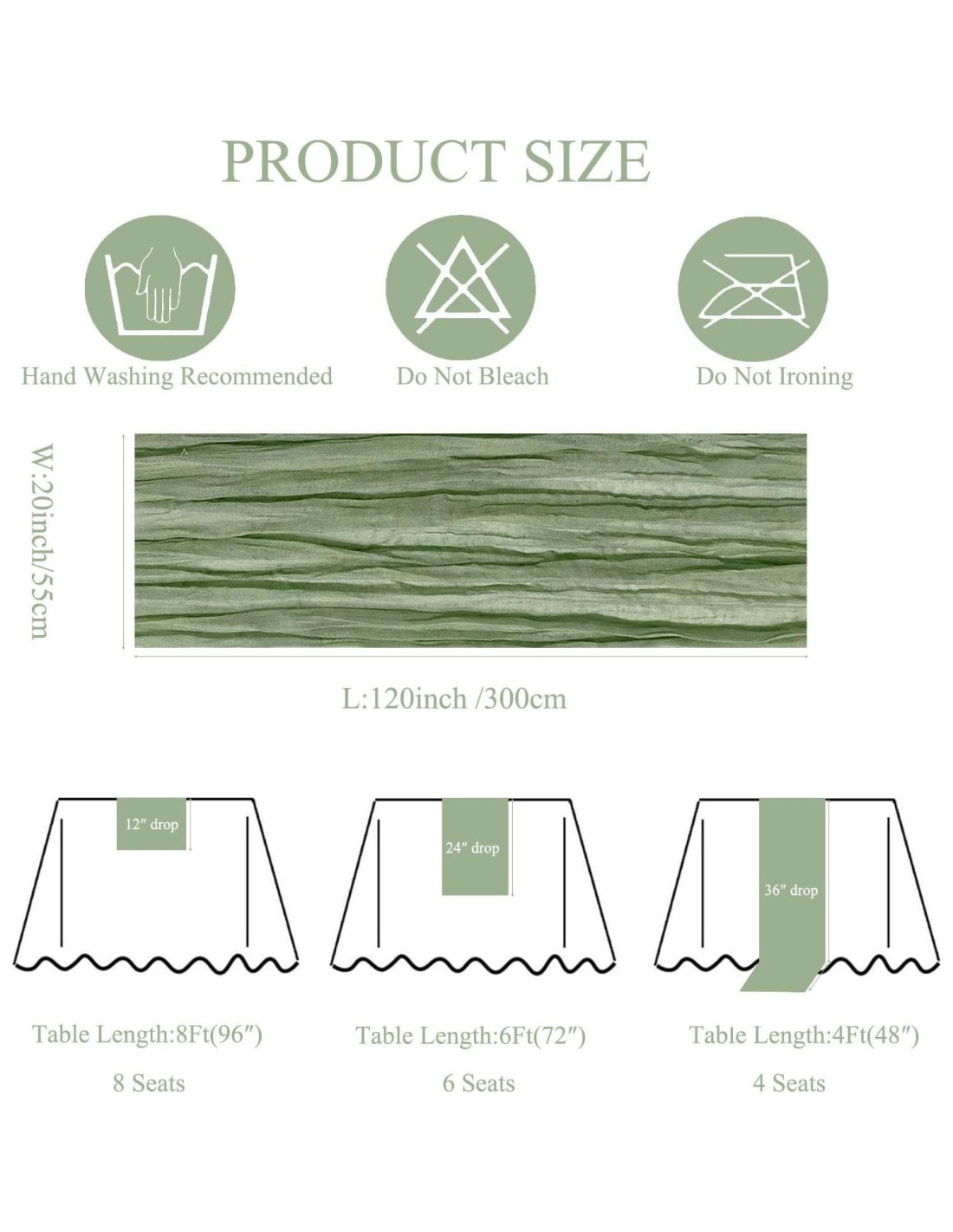 - Artesanías Arrugadas: Los caminos de mesa de gasa adoptan un trabajo de plisado único, lo que hace que la tela del camino de mesa muestre naturalmente una hermosa y elegante textura arrugada. Es fácil crear un hermoso volado en la mesa, o dejarlo flotar suelto en el suelo y agregar un toque elegante a tu mesa en cualquier evento.