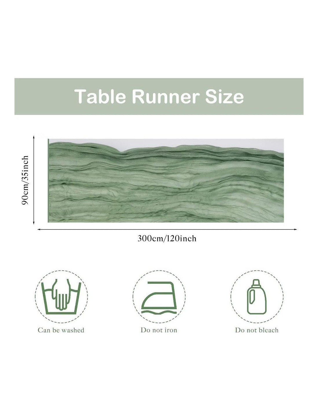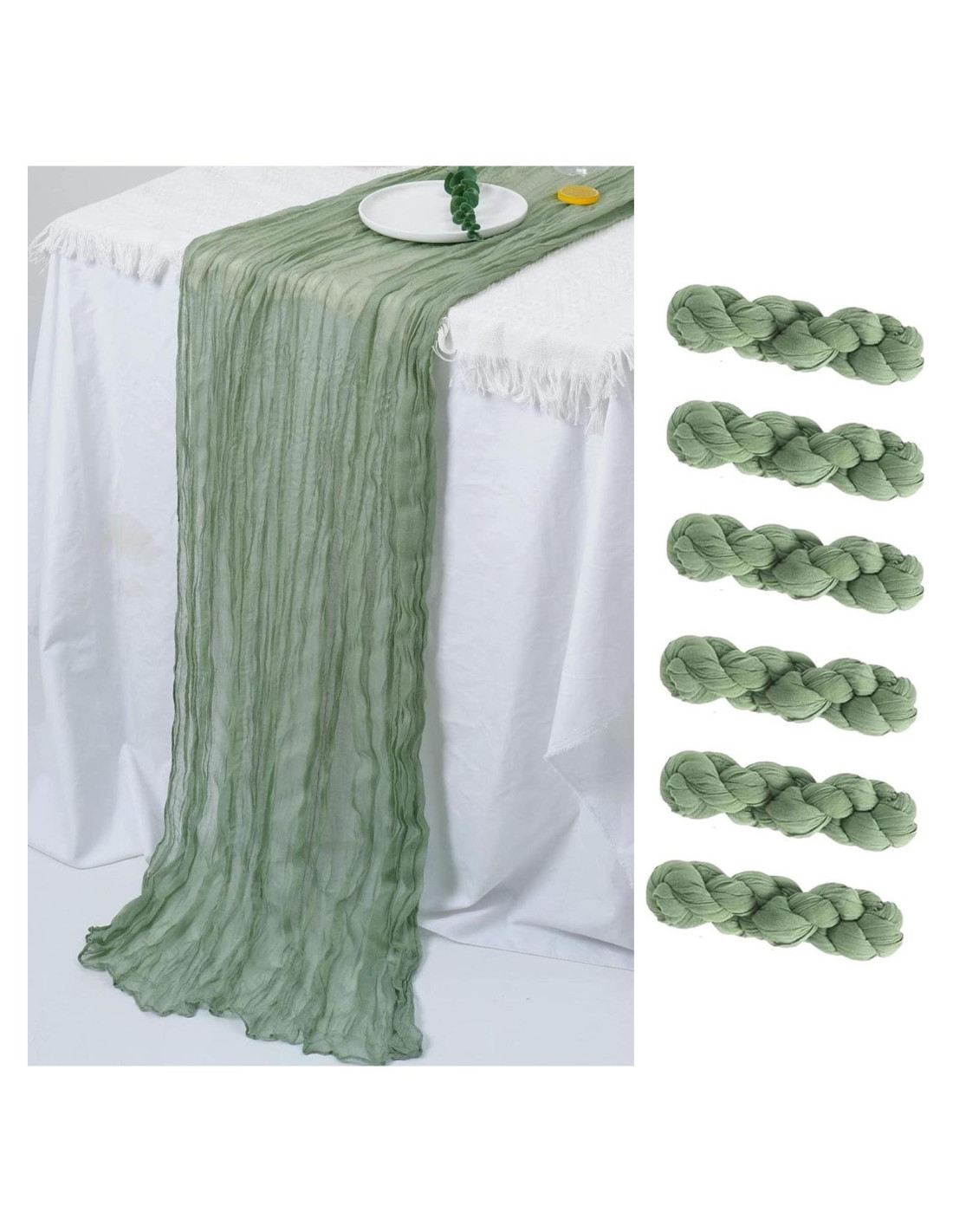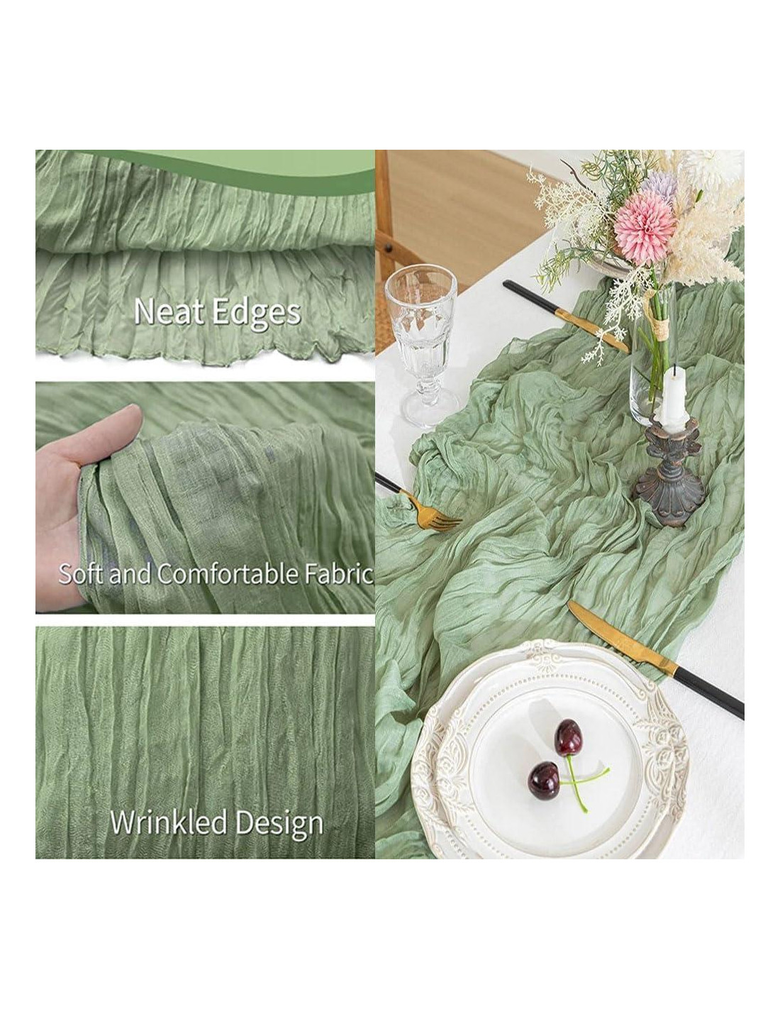 - 1. Tela de Gasa Suave de Alta Calidad: Hecho de queso de tela de poliéster ligero, este camino de mesa presenta una textura arrugada natural y bordes sin costura para un acabado resistente al deshilachado. Su tono verde salvia añade un toque sutil y romántico a cualquier entorno.