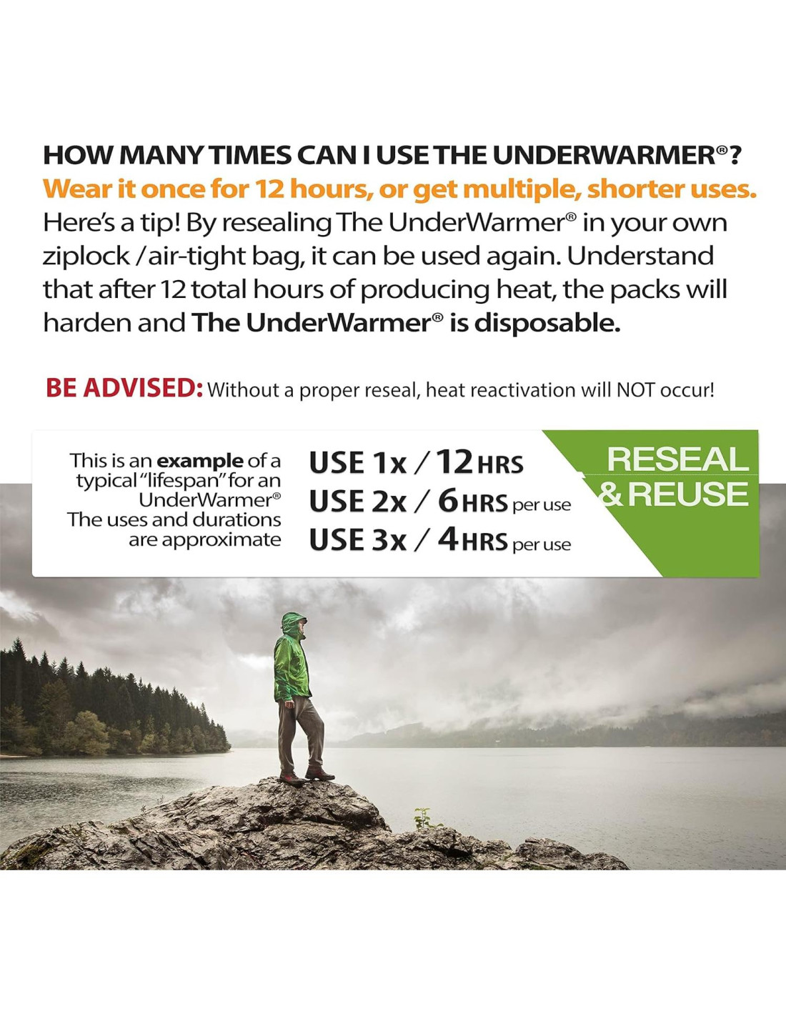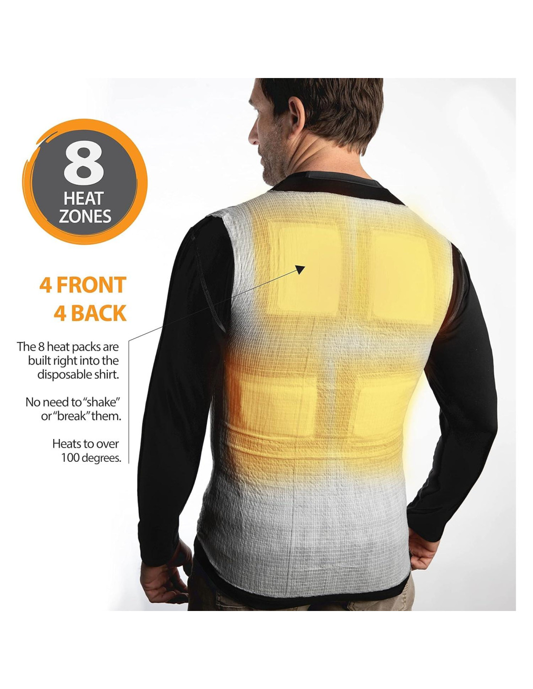 - ACTIVADO Y LISTO EN 30 MINUTOS - 8 paquetes de calor activados por aire significan que estás listo para el frío en un instante. Es la mejor manera de mantenerte caliente sin preparación - no se necesita carga. Simplemente abre el paquete, ponte la camisa y siente el calor (hasta 100F/38C) calentando tu núcleo. SELLA Y REUTILIZA: Si solo se usa durante unas pocas horas, colócala en una bolsa hermética y dejará de producir calor, lista para ser utilizada nuevamente al reabrir.