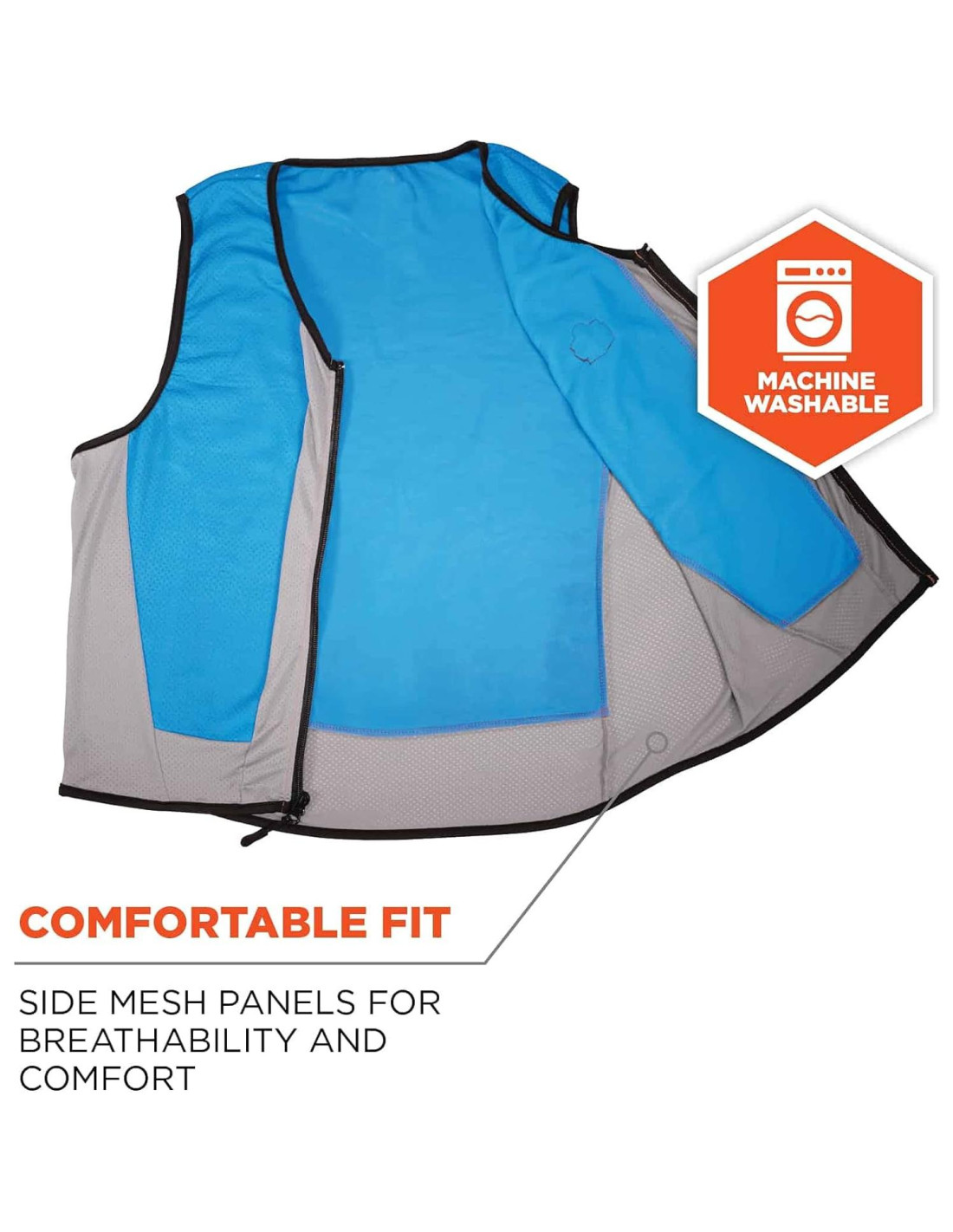 El Chaleco Refrigerante Chill-Its 6667 está hecho con un material PVA ligero que proporciona alivio inmediato del calor en el área central. La construcción ligera está diseñada con paneles laterales de malla transpirable, lo que lo hace más cómodo que otros chalecos evaporativos húmedos que pueden ser pesados de usar. Un cierre frontal ofrece un ajuste personalizado fácil de poner y quitar. Para obtener los mejores resultados, recomendamos que este chaleco refrigerante se use sobre una camiseta y no cubierto por otra ropa. CÓMO ACTIVAR Para activar, simplemente enjuague bajo el agua y escurra, no se necesita hielo ni refrigeración. El material PVA es super evaporativo y se siente más fresco que el aire ambiente, manteniéndote fresco y cómodo durante horas. Lavar a máquina según sea necesario y colgar para secar para una mayor duración, el chaleco se endurecerá a medida que se seque. Todos los materiales PVA se secan duros, para reactivar y suavizar, enjuague bajo el agua. Ideal para construcción, jardinería, techado o cualquier persona que trabaje en el calor.