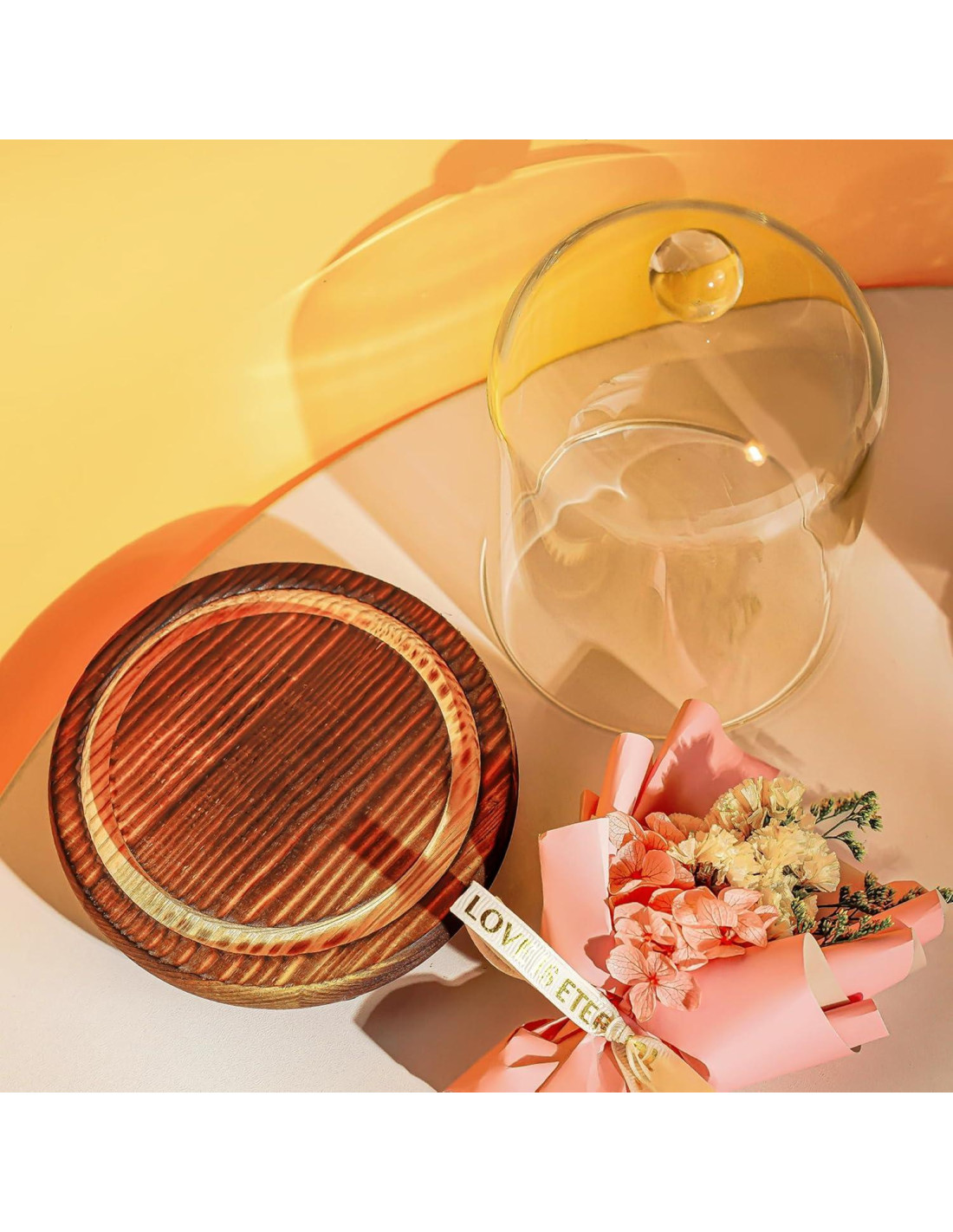 - Campana en Forma de Vidrio: Estas exhibiciones de campana de vidrio están combinadas con una cubierta de vidrio transparente y una base de madera rústica, junto con un pequeño punto en la parte superior de la cubierta de vidrio para un fácil manejo.