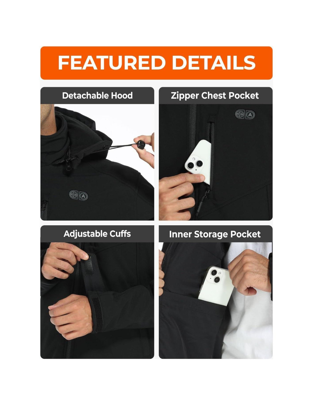 Mantente caliente con nuestra chaqueta de shell calefaccionada, que cuenta con un sistema de calefacción de doble control y capucha desmontable. El calor dirigido incluye calefacción dedicada en los brazos y zonas adicionales en el pecho izquierdo y derecho y la parte superior de la espalda. Ideal para actividades al aire libre como senderismo, camping y ciclismo, esta chaqueta asegura comodidad personalizable en cualquier clima, manteniéndote activo y caliente. Te protege de la lluvia ligera y las salpicaduras, previniendo la pérdida de calor y manteniendo la comodidad y transpirabilidad. La capucha desmontable ofrece cobertura y estilo flexibles. Acceso rápido a llaves, tarjetas y pequeños objetos con el bolsillo en el pecho con cremallera. Dos bolsillos de mano con cremallera te permiten almacenar y acceder fácilmente a tus pertenencias mientras estás en movimiento. Dobladillo ajustable con cordón para asegurar un ajuste ceñido, evitando que los vientos fríos entren y proporcionando comodidad cálida.