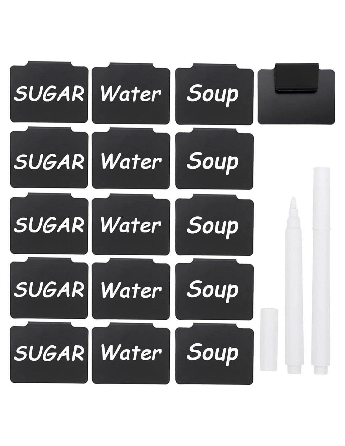 - [Movible y Borrable] Puedes borrar las pequeñas pizarras y escribir en ellas una y otra vez. El marcador de tiza se limpia fácilmente por completo con un paño húmedo dejando ningún residuo detrás. Las etiquetas de la despensa se mantienen en su lugar, no se caerán de la cesta cuando saques artículos. Y el clip es un poco flexible para ajustarse sobre los mangos de la cesta.