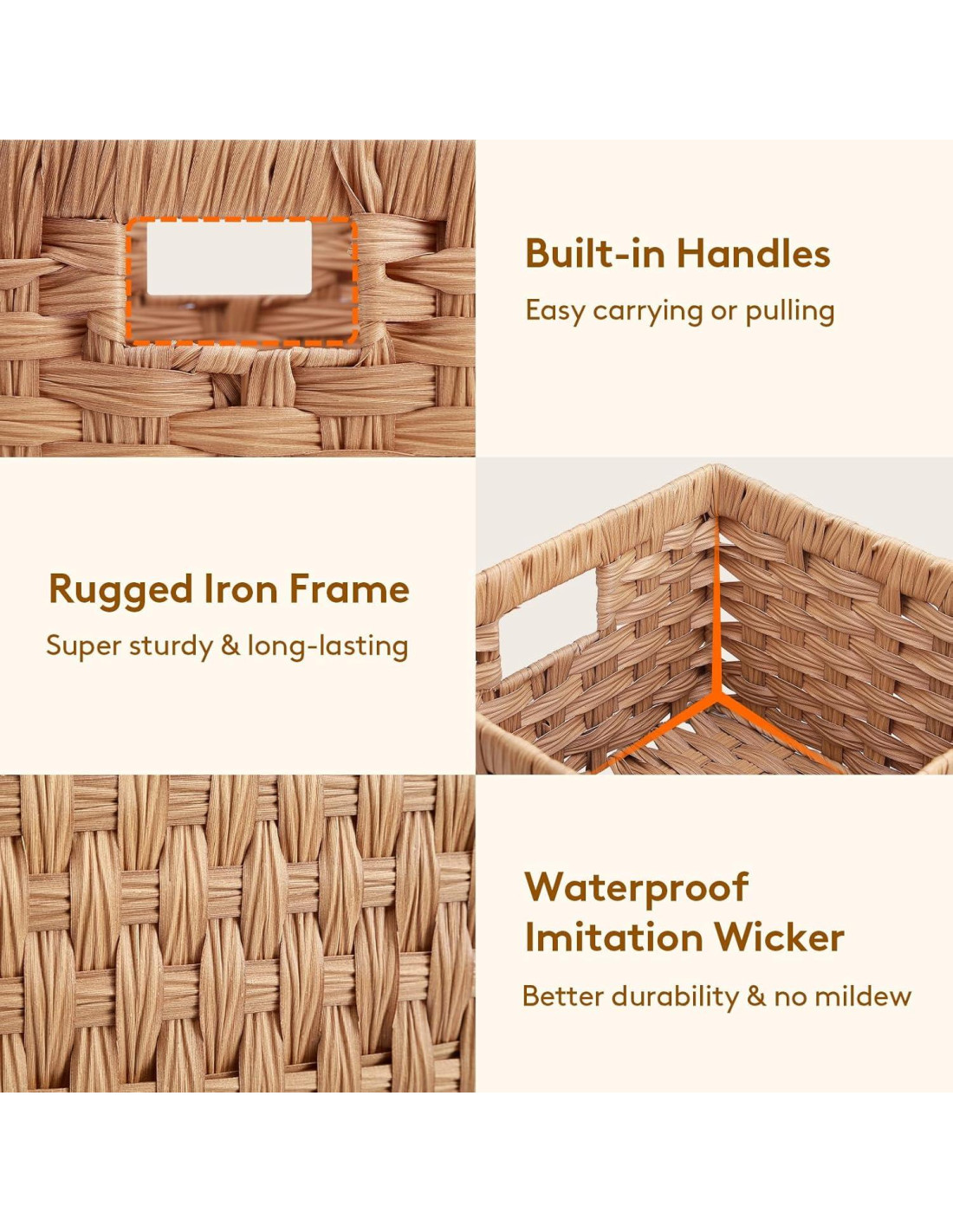 - Diseño de Mangos y Apilable: Cada cesta rectangular de imitación de mimbre tiene dos mangos incorporados para facilitar el transporte; apilables para ahorrar espacio cuando no están en uso