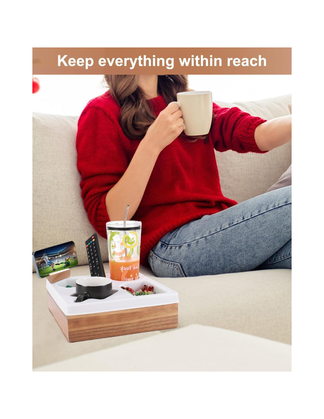 - Estabilidad mejorada: El forro de silicona de la bandeja para soporte de taza de sofá proporciona mejor estabilidad para botellas de bebidas y tazas, reduciendo la probabilidad de volcarse. Al mismo tiempo, los artículos son fáciles de poner y sacar. La base de madera maciza del caddy a prueba de derrames con soporte para taza le da el peso adecuado, por lo que el soporte para taza de sofá no se volcará cuando realices movimientos corporales en el sofá o la cama