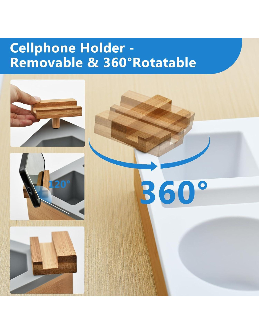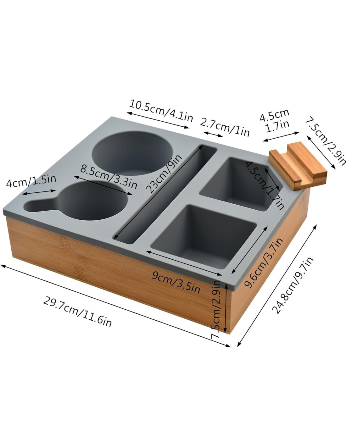 - ALTA CALIDAD. Esta bandeja para sofá es una combinación perfecta de base de bambú sólido y organizador de silicona premium. Un soporte también es parte de esta bandeja para sofá. Puedes conectar el soporte a la bandeja si necesitas un soporte para celular o tableta. Además, el soporte es rotatable 360.