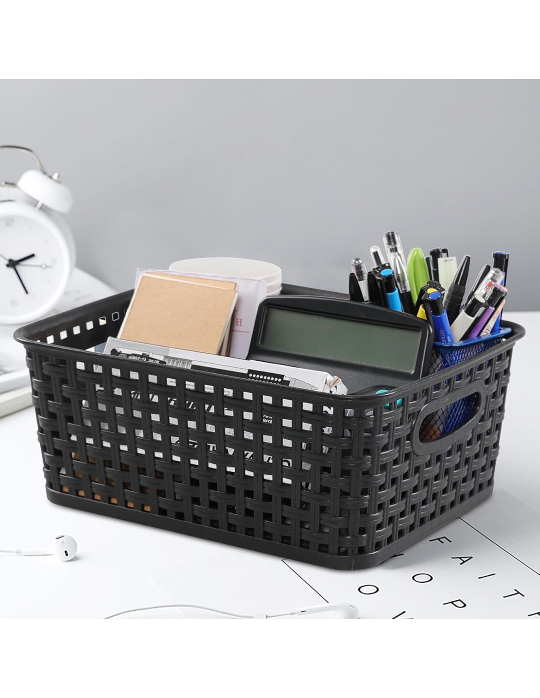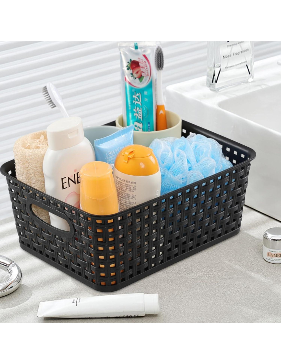 Con el material de plástico de alta calidad, las cestas se pueden usar en diferentes ocasiones durante mucho tiempo. Cuanto más tiempo se usen, más se ahorra. Es perfecto para armarios, estantes de closet, estanterías, mesas, cajones, etc. El diseño de patrón tejido permite un almacenamiento transpirable. Estos agujeros de aire permiten que las cosas dentro de la cesta se sequen más rápido y evitan que las cosas se pongan malolientes. Es perfecto para despensa, cocina, baño, tocador, etc. Las asas convenientes hacen que sea mucho más fácil mover y transportar. Puedes sacarla sin esfuerzo de los estantes o sacarla del cajón, haciendo que el almacenamiento de objetos varios sea más rápido y práctico. Dimensiones: 10.05" (25.4 cm) x 7.5" (19.05 cm) x 3.95" (10.03 cm) Color: negro, verde profundo, gris, azul marino, blanco y rojo vino Material: plástico Uso múltiple Patrón de tejido cuadrado