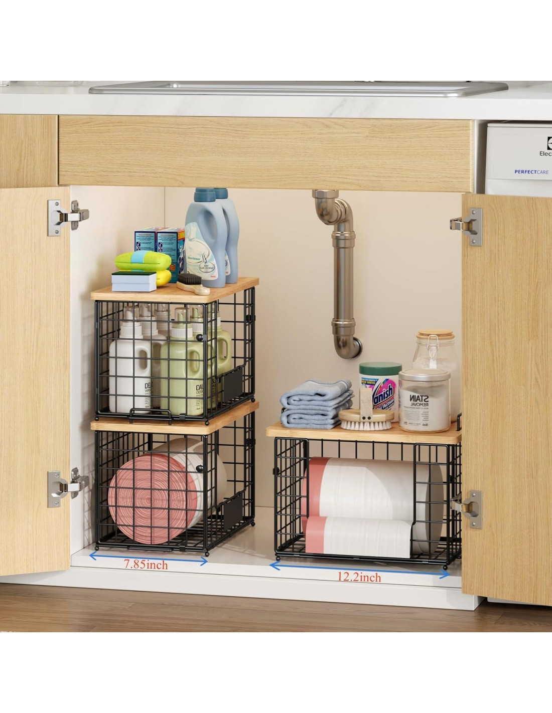 - [2-Pack & Tamaño XL] 2 sets de 12.2in (31 cm) * 7.85in (20 cm) * 9.44in (24 cm) cestas de alambre XL para almacenamiento en encimeras de despensa/armario, y el diseño cuadrado permite que las cestas logren un almacenamiento más completo. Ambas cestas tienen cuatro patas estables en la parte inferior para una colocación y apilamiento seguros.