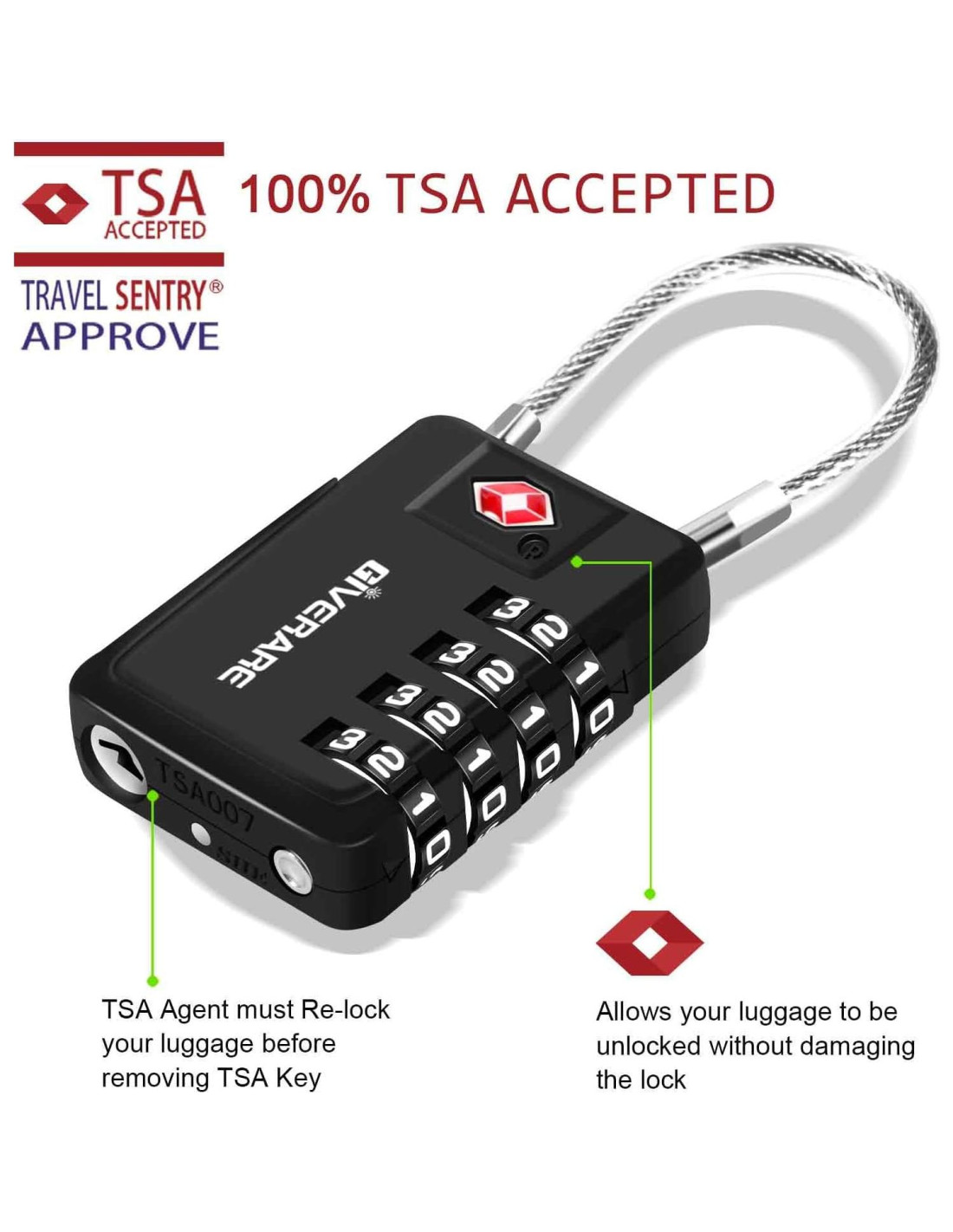 - CANDADO VERSÁTIL PARA TODAS LAS SITUACIONES: El candado de cable TSA GIVERARE es perfecto para uso en interiores y exteriores, asegurando maletas, estuches duros, estuches de armas, maletines, taquillas, bolsos, mochilas, bolsas para laptop y cualquier cosa que se pueda asegurar, protege tus objetos preciosos sin necesidad de llaves