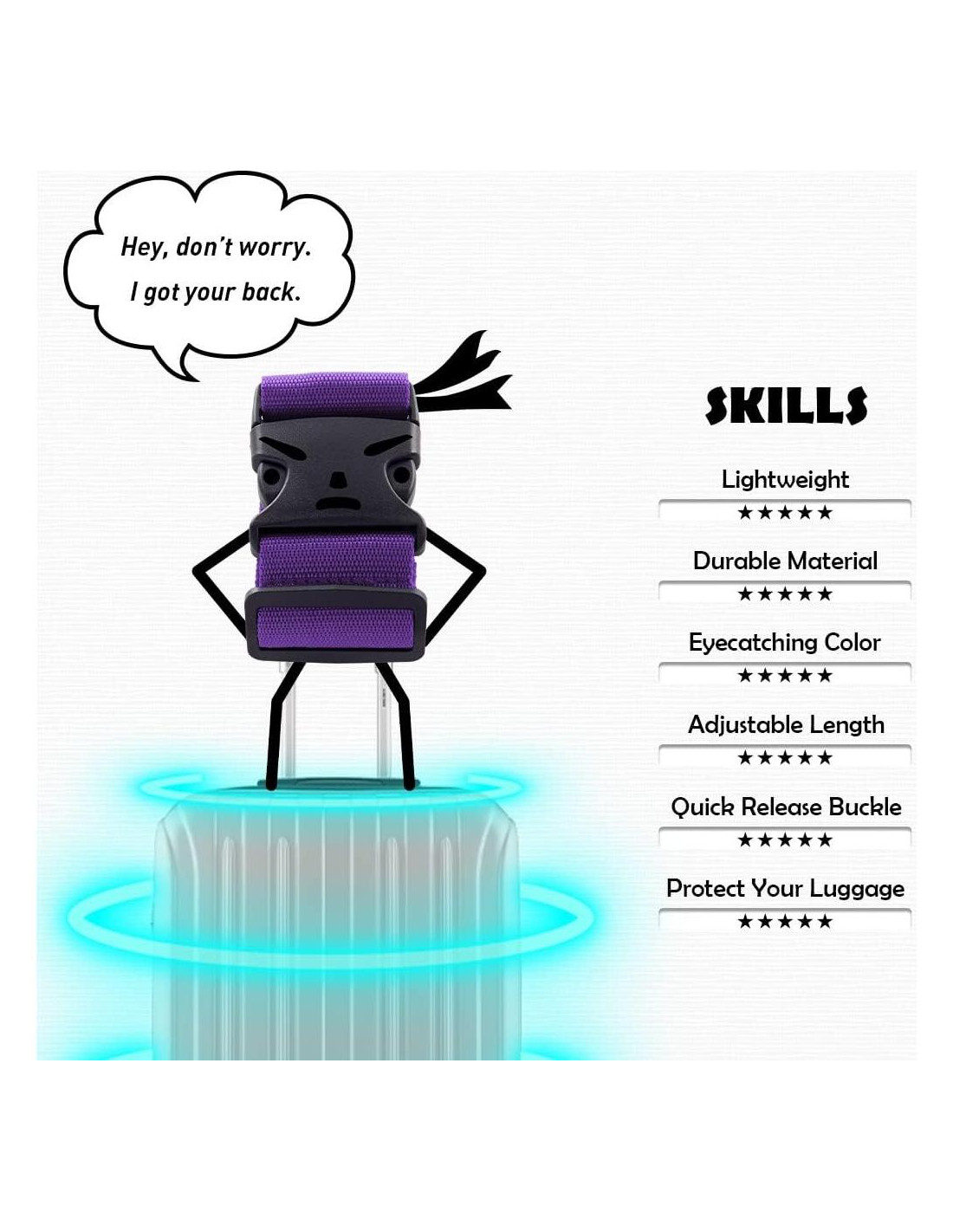 - Material de alta calidad Correa de maletas está hecha de nylon de alta calidad y hebilla hecha de plástico de alta calidad y no es fácil de romper, es muy fuerte y resistente al desgaste