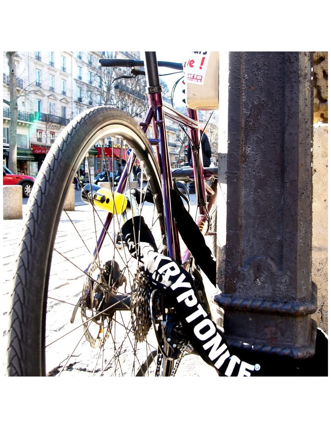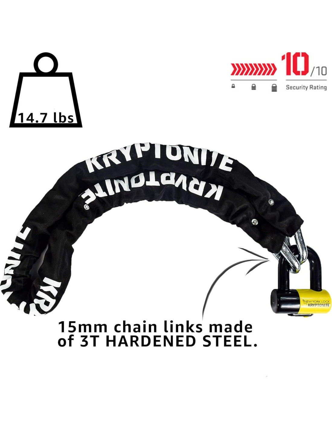 La cadena Kryptonite New York Legend cuenta con enormes eslabones de cadena redondos de 15mm hechos de acero endurecido 3T con una cubierta protectora de nylon sujeta con cierres de gancho y bucle. El candado de disco New York presenta un grillete de acero endurecido de 15mm con un diseño de doble cerrojo anti-rotación que resiste cortadores de pernos y ataques de palanca. El candado también cuenta con un diseño de barra transversal ovalada patentada que es más fuerte que un tubo redondo típico. El cilindro de estilo disco del candado con llave central está protegido por un recubrimiento de vinilo y es resistente a la manipulación y perforación. La llave también cuenta con una cubierta deslizante para proteger el cilindro de suciedad y escombros cuando no está en uso. Incluye tres llaves de acero inoxidable con un diseño ergonómico para reducir el torque y evitar que se doblen o rompan. Calificado con 10/10 en nuestra escala de seguridad, la cadena de 15mm New York Legend 1515 y el candado de disco New York de 15mm son ideales para paradas rápidas en áreas metropolitanas importantes y durante todo el día y la noche en campus universitarios, suburbios y áreas rurales. La combinación de estas excelentes características y nuestros programas de soporte, incluyendo seguridad de llaves, protección antirrobo y garantía de por vida, hacen de los candados para bicicletas Kryptonite la mejor opción para proteger lo que valoras.