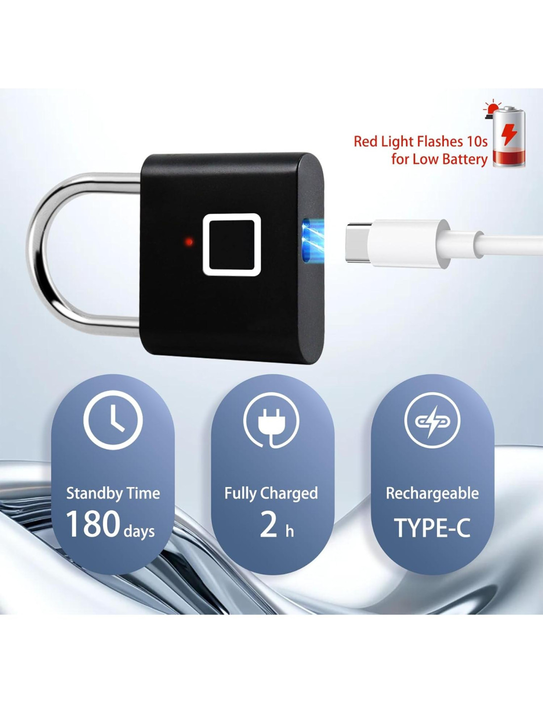 - Conveniencia Sin Llaves No más llaves perdidas o combinaciones olvidadas. Este candado inteligente utiliza un avanzado reconocimiento de huellas dactilares, brindándote acceso rápido y seguro con solo un toque - sin llaves, sin códigos, sin complicaciones. Incluye 1 candado de huellas dactilares y 1 cable de carga USB para una configuración rápida y fácil.