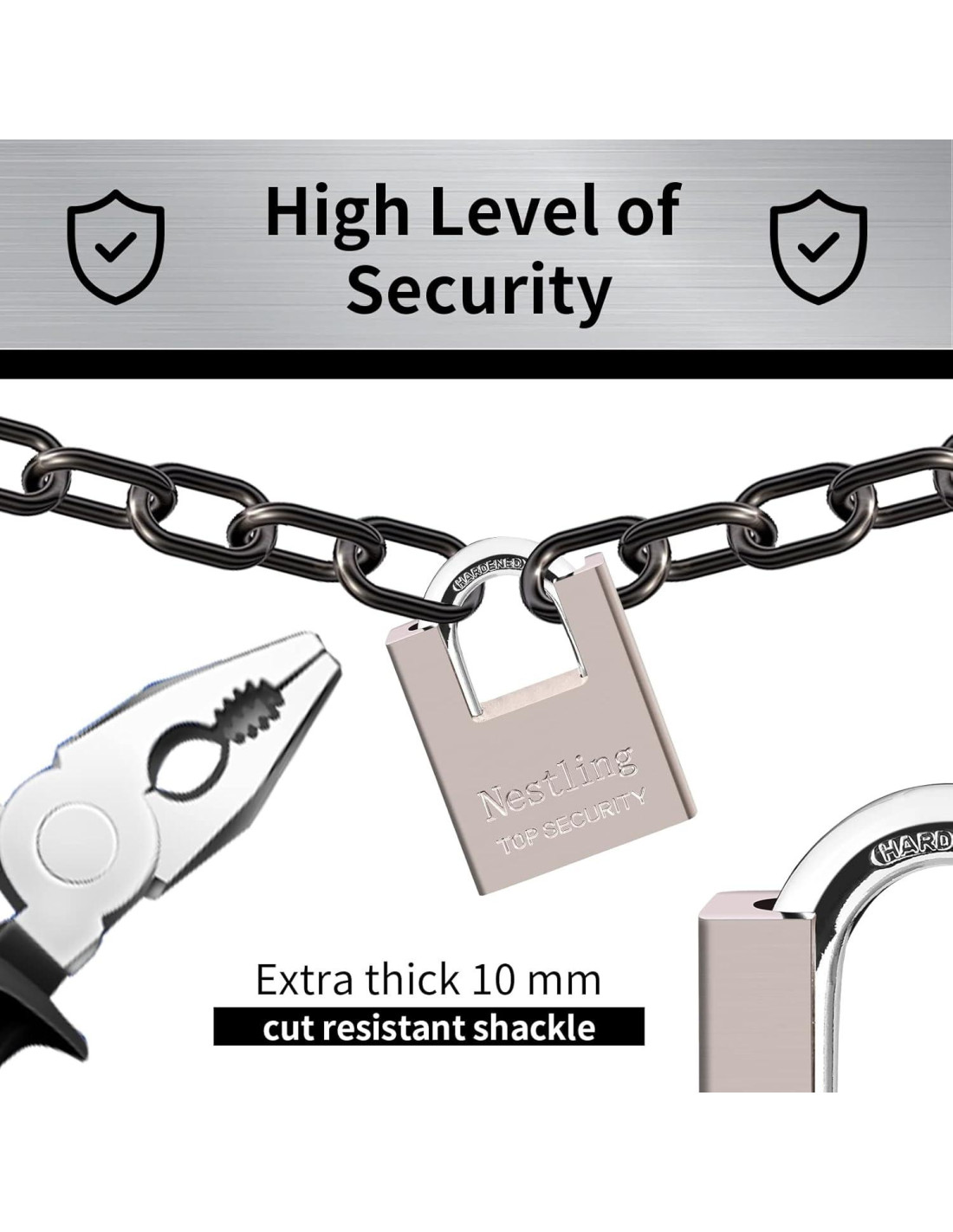 - Diseño de Viga Envuelta, Anti-corte, Anti-sierra. El candado con llave tiene un diseño de grillete medio envuelto que minimiza la exposición del grillete para aumentar la seguridad. La viga del candado de 10mm es más gruesa y dura que otros candados normales, y está hecha de acero endurecido de alta calidad. Puede proporcionar mayor dureza y mejor resistencia al corte.